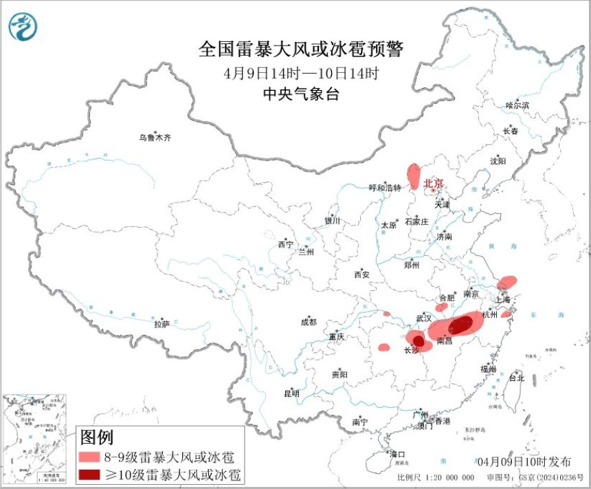 中央气象台4月9日10时继续发布强对流天气黄色预警