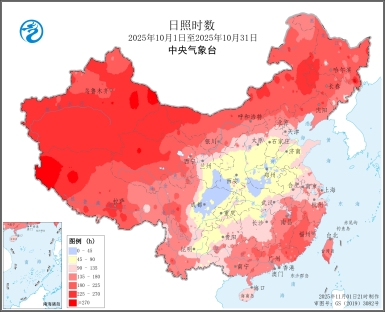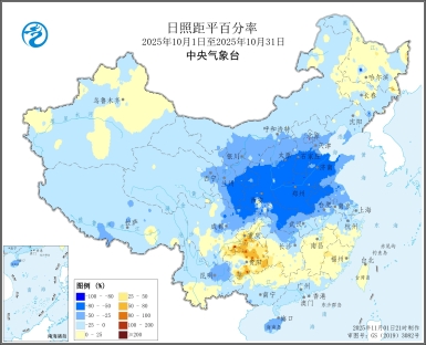 图3 全国日照时数及日照距平百分率图(2025年10月1日至10月31日)