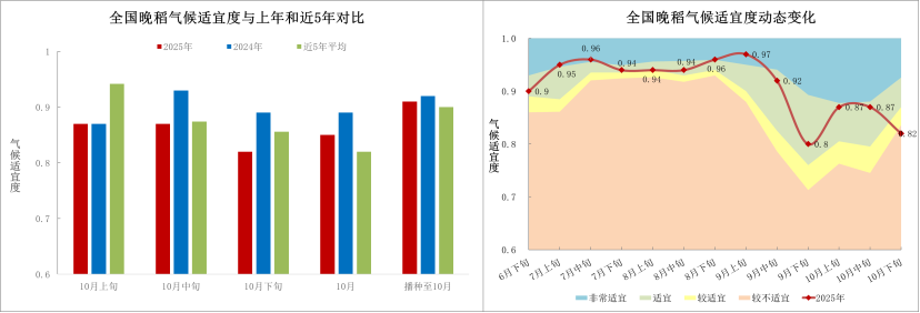 播种以来,全国晚稻平均气候适宜度为0.91,与近五年平均和上年同期基本持平,适宜度等级为适宜。其中,10月全国晚稻平均气候适宜度为0.85,较近五年平均高0.03,比上年同期低0.04,适宜度等级为适宜(图4)。