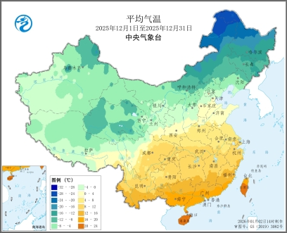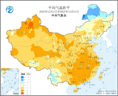 图1 全国平均气温及气温距平图(2025年12月1日至12月31日)
