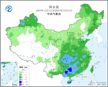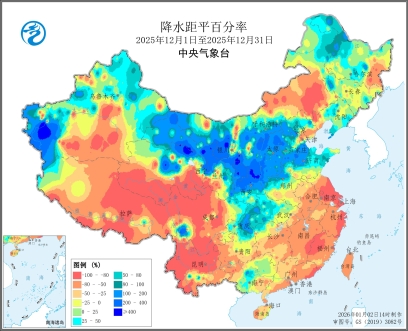 图2 全国降水量及降水距平百分率图(2025年12月1日至12月31日)
