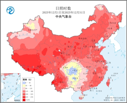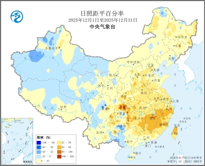图3 全国日照时数及日照距平百分率图(2025年12月1日至12月31日)
