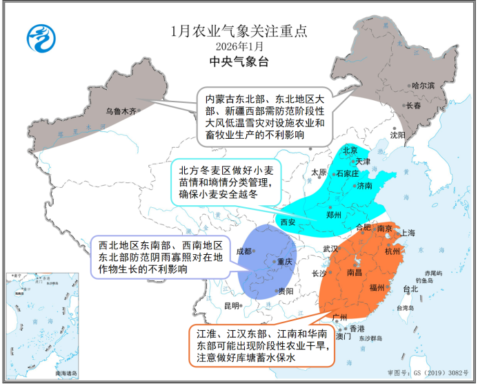 1月东北和新疆农牧业防范低温风雪灾害 长江中下游防范农业干旱