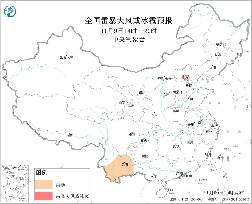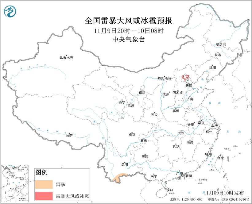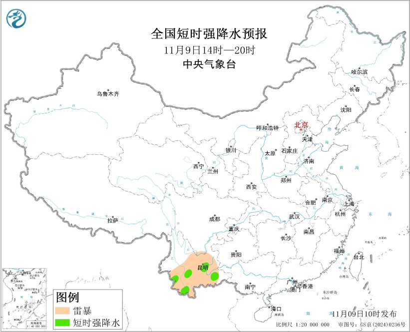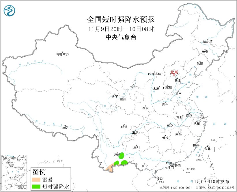 预计11月9日14时至10日08时,云南中南部部分地区将有短时强降水天气,小时雨量20-30毫米,局地可达30毫米以上。
