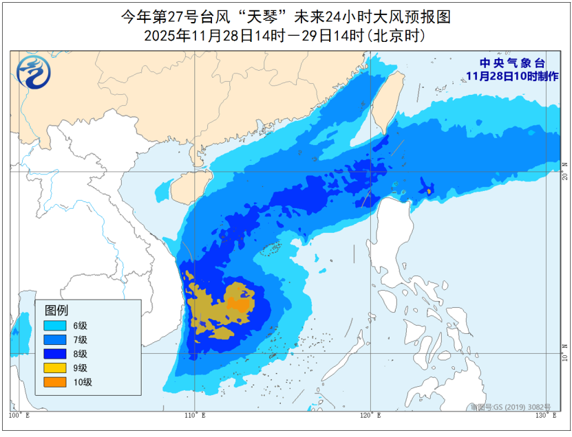 大风预报:28日14时至29日14时,受台风和冷空气的共同影响,台湾海峡、台湾以东洋面、巴士海峡、南海大部及东沙群岛、西沙群岛、中沙群岛、南沙群岛、黄岩岛附近海域、北部湾、台湾沿海、福建沿海、广东沿海、海南岛东部沿海将有6-8级大风,其中,南海西南部的部分海域风力可达9级,“天琴”中心经过的附近海域风力可达10级,阵风11-12级。
