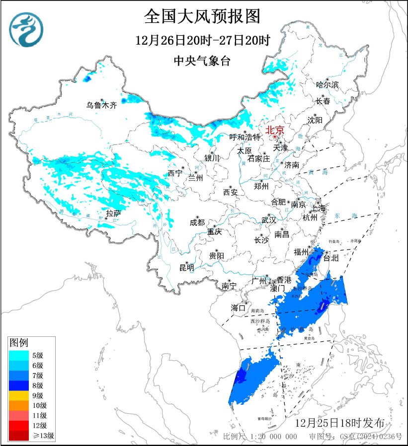 12月26日20时至27日20时,新疆北部和东部、内蒙古中西部、西藏中北部、青海南部等地有5~6级风,阵风7~8级;台湾海峡、巴士海峡、南海东北部和中东部海域、南海西南部海域将有7级、阵风8~9级的大风,其中部分海域风力可达8级、阵风9~10级。