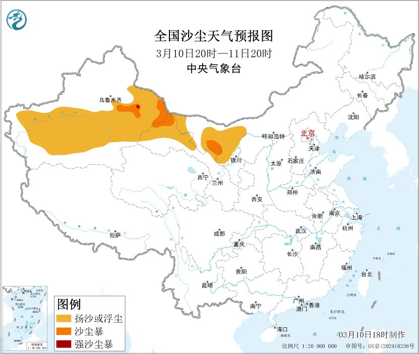 受冷空气大风影响,预计3月10日20时至11日20时,新疆东部和南部、内蒙古西部、甘肃西部等地的部分地区有扬沙或浮尘天气,其中,新疆东部、内蒙古西部、甘肃西部局地有沙尘暴或强沙尘暴。