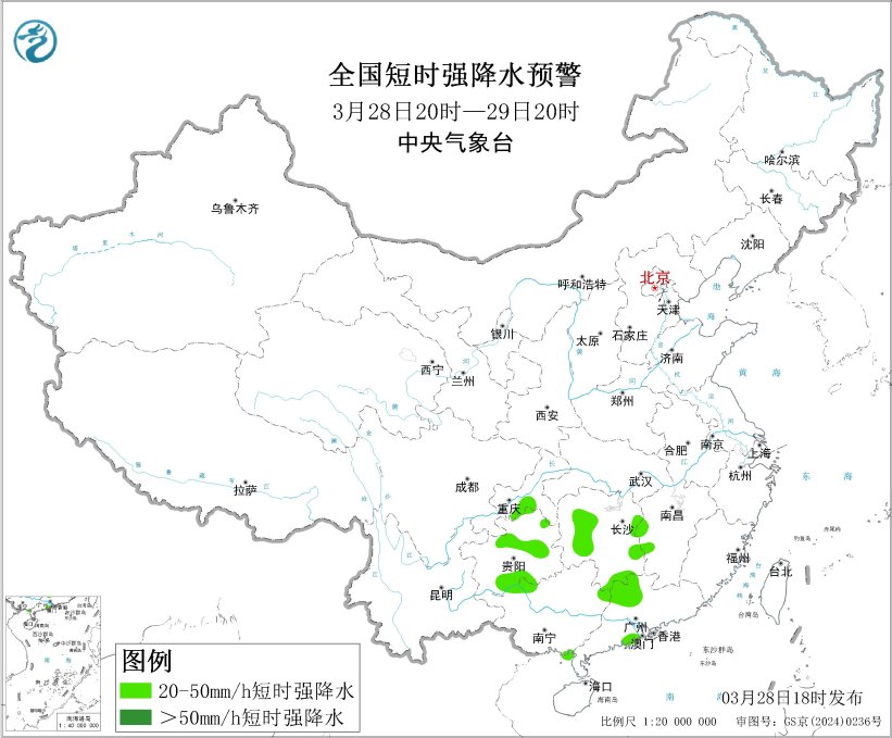 预计3月28日20时至29日20时,湖南东北部和南部、江西中西部、广西北部和西部、广东西北部、云南中南部、贵州东南部等地的部分地区将有8级以上雷暴大风或冰雹天气;湖南西部和东部、江西西部、广西西北部、广东北部、重庆南部、贵州中南部等地的部分地区将有小时雨量大于20毫米的短时强降水天气。