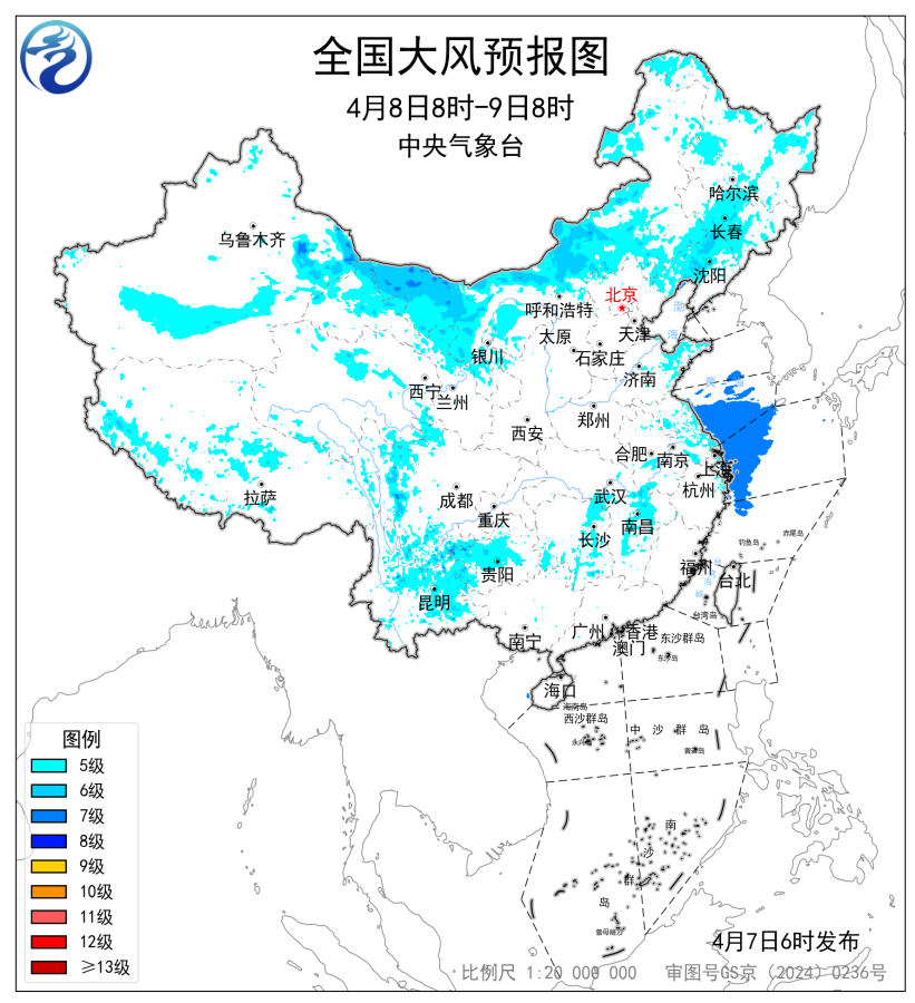 预计,4月8日08时至9日08时,新疆东北部和南疆盆地、内蒙古、辽宁、吉林中部、甘肃河西地区、宁夏、川西高原、西藏中西部、云南、贵州西部以及湖南东部、江西北部、江苏东部、山东半岛等地部分地区有5~7级风,阵风7~9级,局地阵风10级以上;黄海南部海域、东海西北部海域将有7级、阵风8级的风。