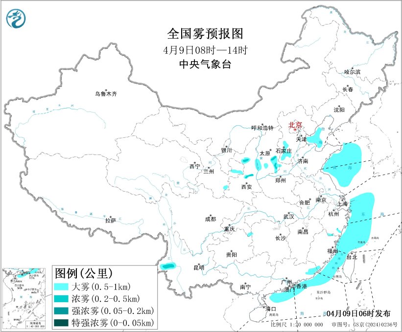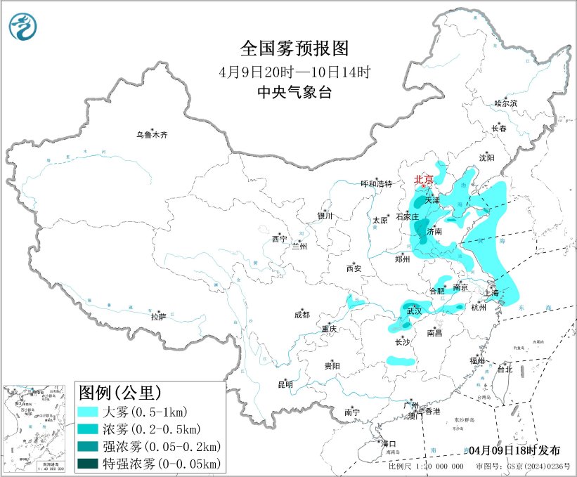 预计,4月9日夜间至10日上午,渤海、渤海海峡、黄海北部和西部海域、东海西北部海域、长江口附近海域将有能见度不足1公里的大雾。此外,河北中南部、北京南部、天津西部、河南东北部、山东西部和北部、江苏北部、安徽中南部、湖北东部、湖南东北部等地的部分地区有大雾天气,局地有能见度不足500米的浓雾。