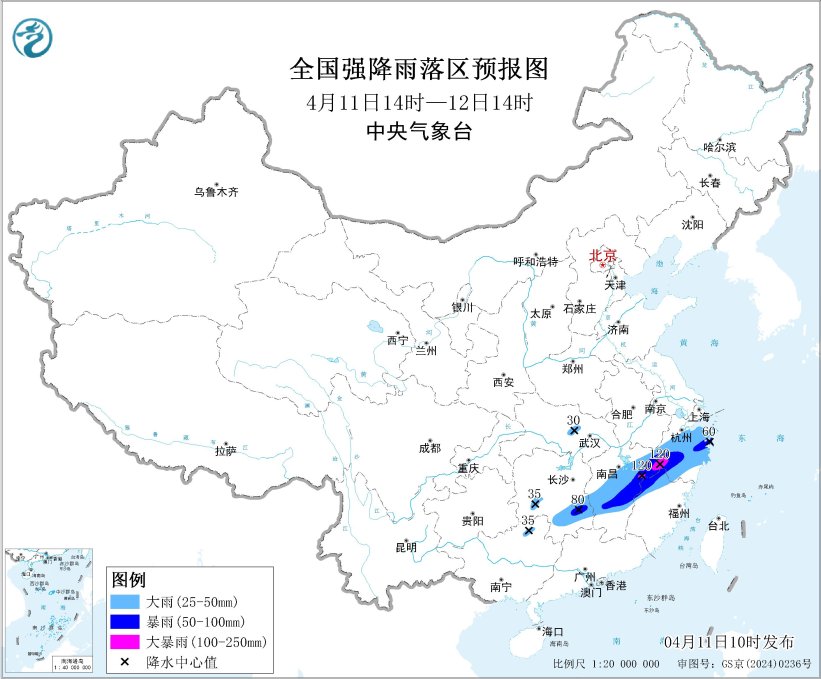 预计,4月11日14时至12日14时,湖南南部、江西中部和东北部、福建西北部、浙江大部、广西东北部等地部分地区有大到暴雨,其中,江西东北部、浙江西南部等地局地有大暴雨(100~120毫米)。上述部分地区伴有短时强降水(最大小时降雨量20~40毫米,局地可超过50毫米),局地有雷暴大风或冰雹等强对流天气。