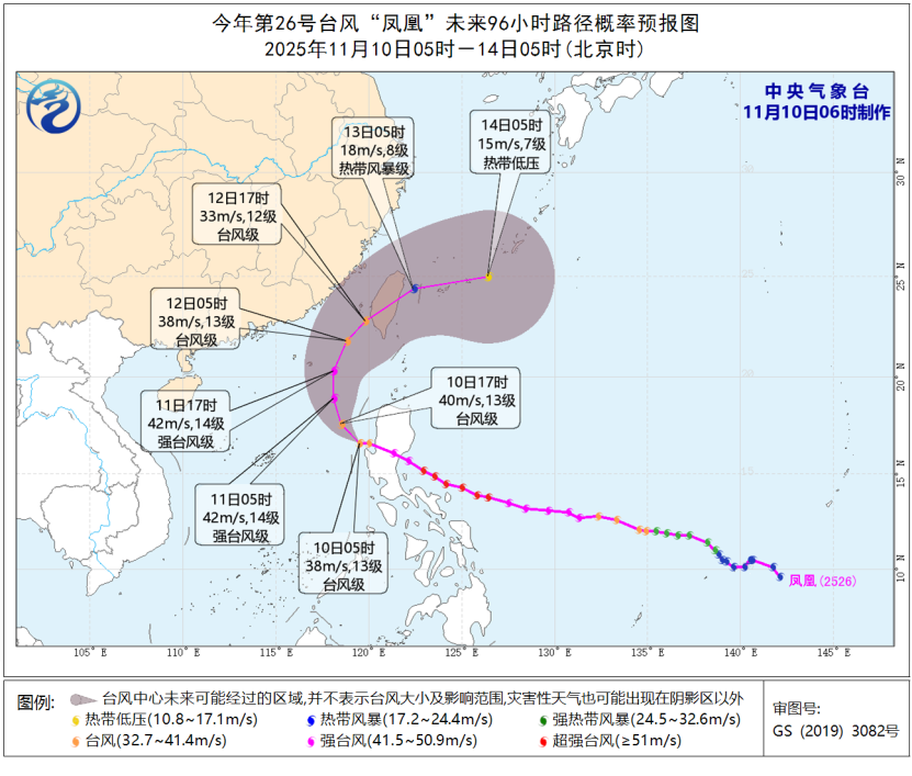 大风预报:10日08时到11日08时,东海南部海域、台湾以东洋面、南海大部、福建沿海、广东沿海、台湾岛沿海将有6-8级、阵风9-10级的大风,台湾海峡、巴士海峡、南海东北部和中东部、黄岩岛、东沙群岛风力可达9-11级,阵风12-13级,台风“凤凰”中心经过的附近海域和地区风力可达12-14级,阵风15-16级。