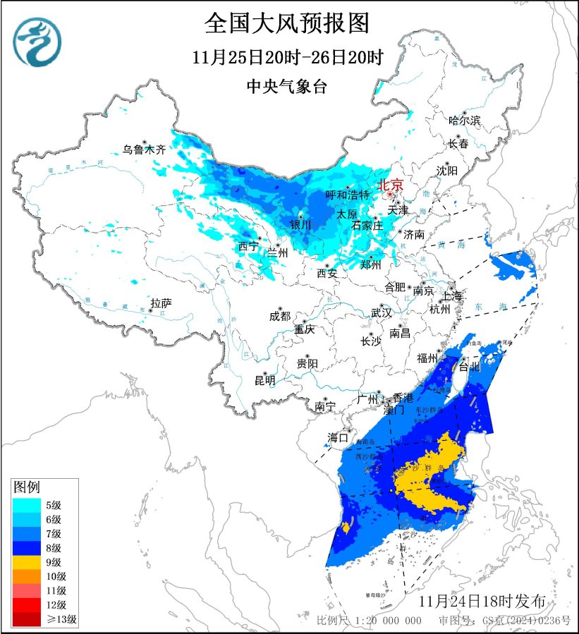 11月25日20时至26日20时,新疆东部、内蒙古中西部、青海北部、甘肃河西、宁夏、华北西部、黄淮西部等地部分地区有5~7级、阵风8~10级的大风;台湾海峡、台湾以东洋面、巴士海峡、南海大部海域将有7~8级、阵风9~10级的大风,其中台湾海峡、南海东部和西南部的部分海域风力可达9级,阵风10~11级。