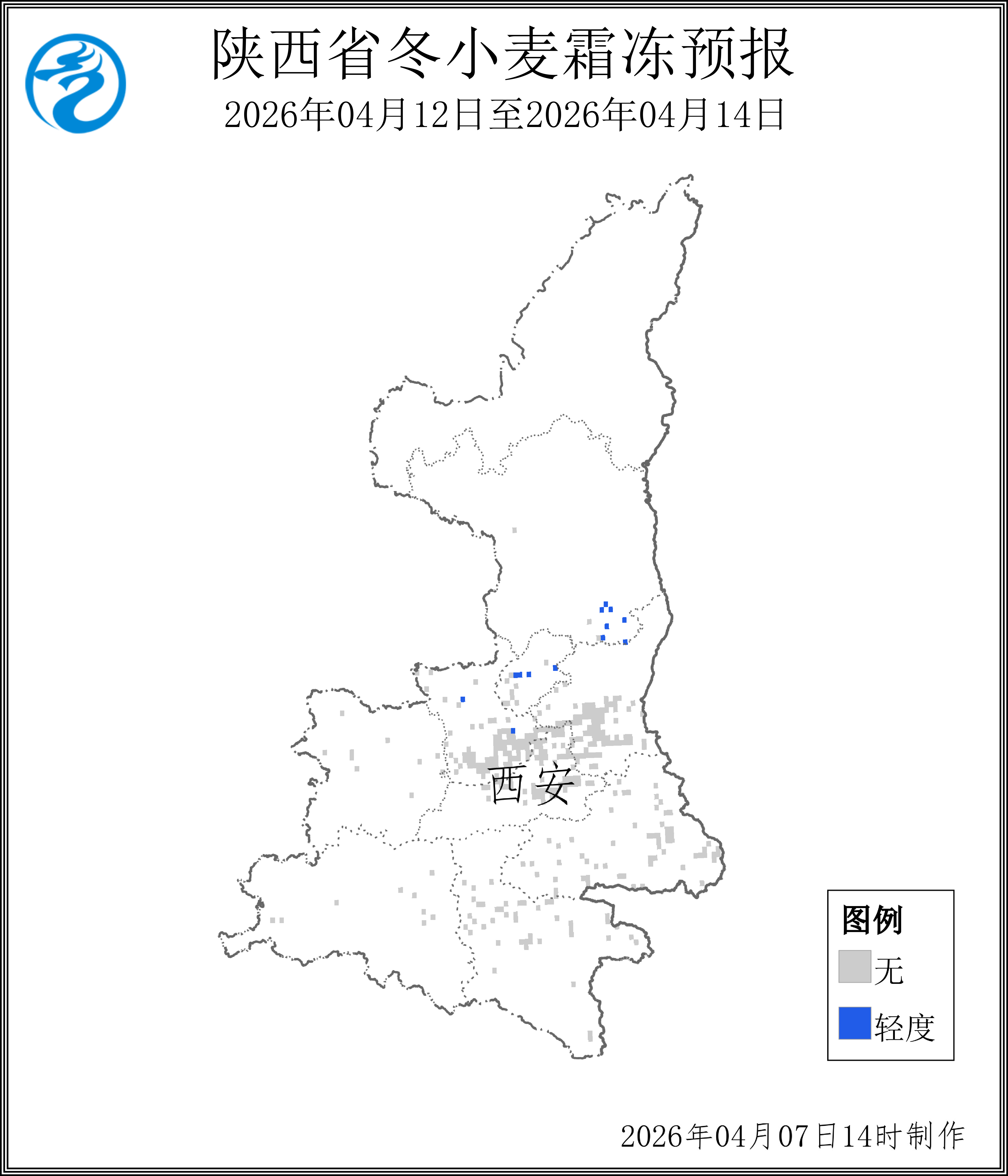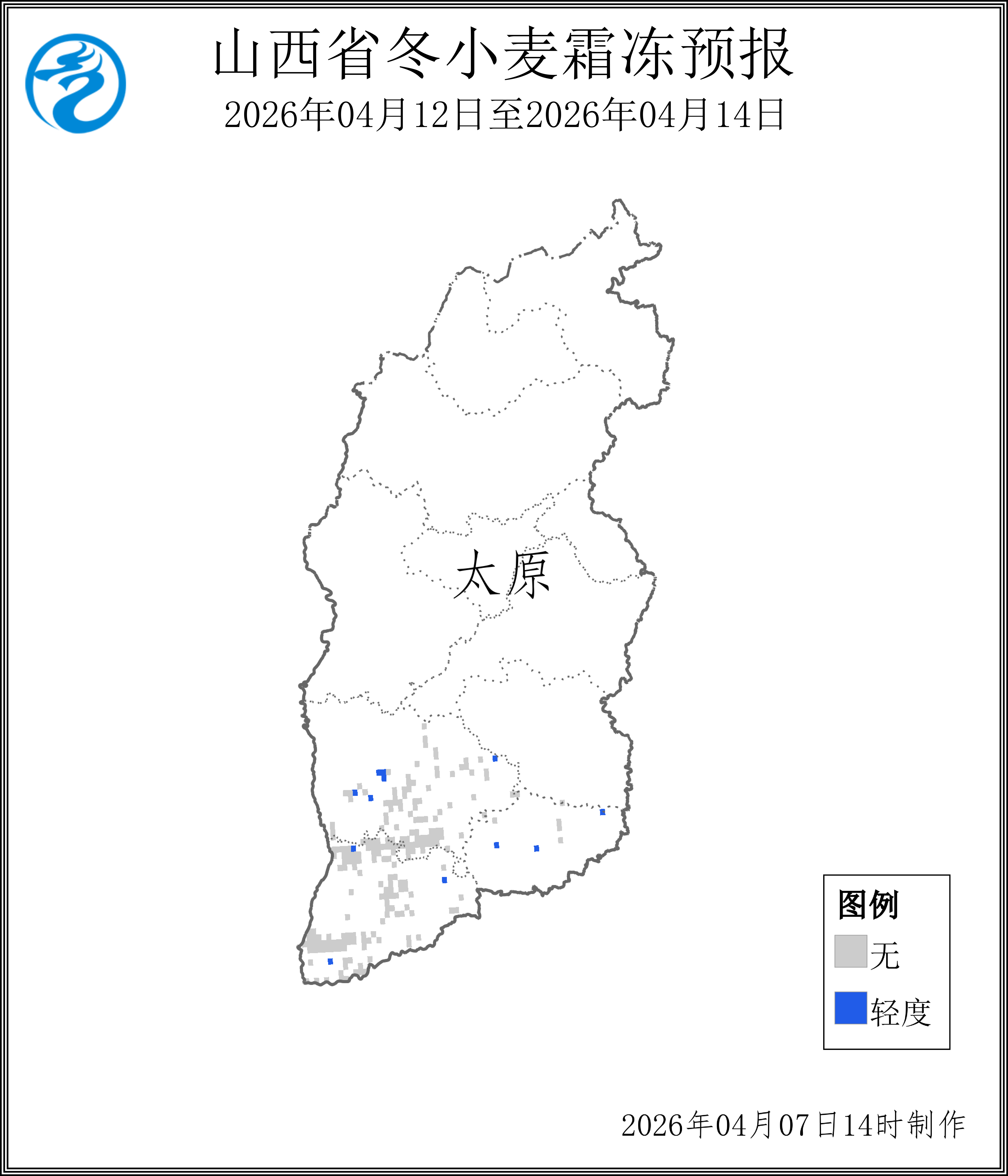附图 4月12-14日陕西(上)、山西(下)冬小麦霜冻预报
