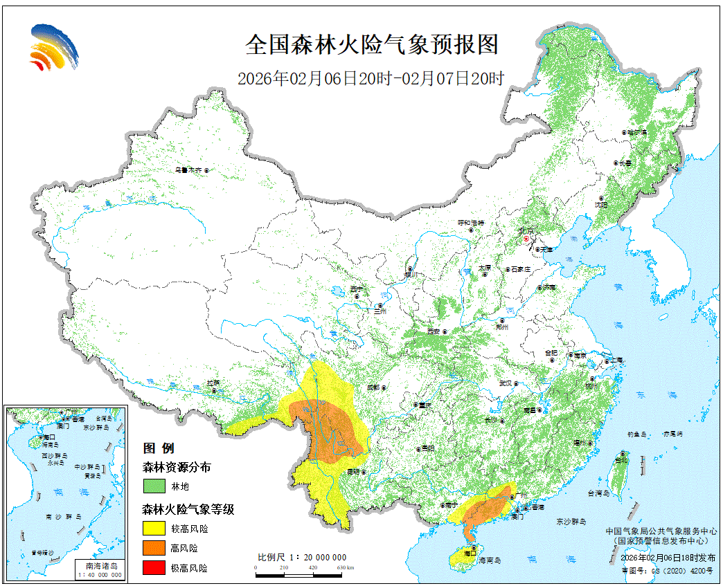预计,2026年2月6日20时至2月7日20时,广东西部、广西东南部、海南大部、四川西部和南部、云南北部和西部、西藏东部等地的部分地区森林火险气象等级较高,其中,广东西南部、广西东南部、四川西南部、云南西北部、西藏东南部的局部地区森林火险气象等级高。请各有关单位严加防范,加强火源管理,确保林区安全。
