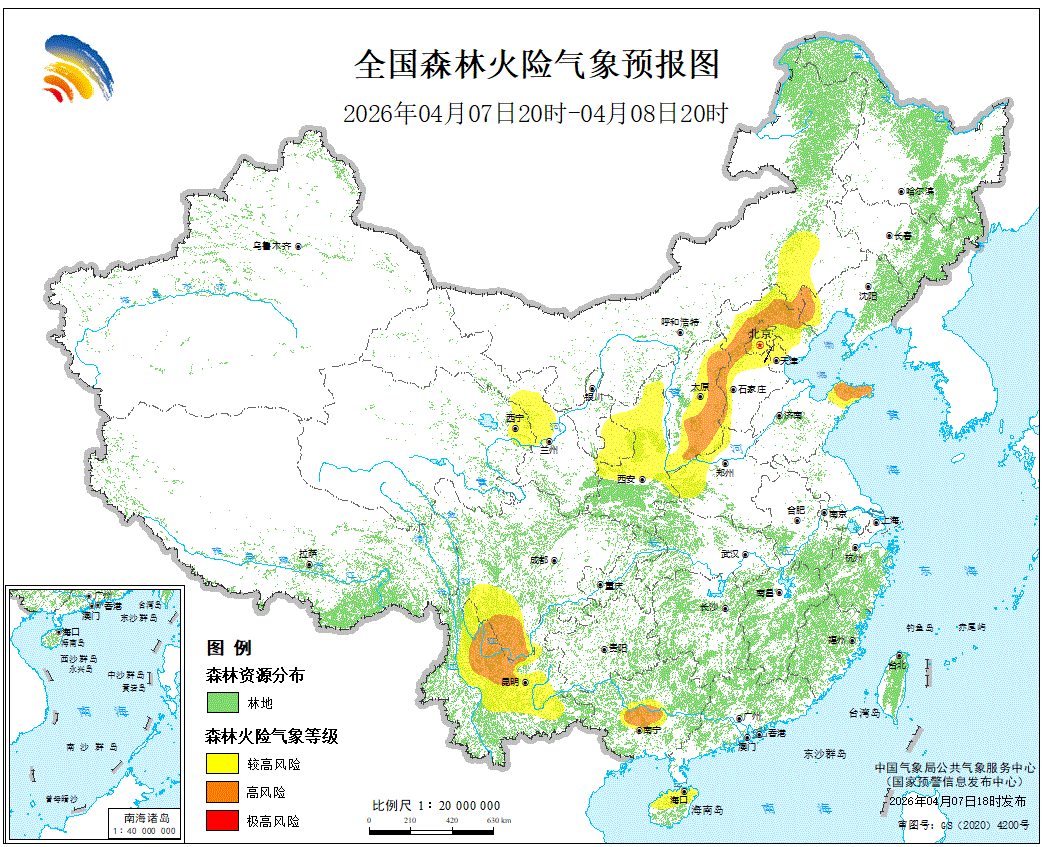 预计,2026年4月7日20时至4月8日20时,北京西部和北部、天津北部、河北西部和北部、山西东部和南部、内蒙古东部、辽宁西部、山东东部、河南西北部、广西中部、海南北部、四川西部和南部、云南东部和北部、陕西中部和北部、甘肃中部和东部、青海东北部等地的部分地区森林火险气象等级较高,其中,北京西部和北部、河北西部和北部、山西东部和南部、辽宁西部、山东东部、广西中部、四川南部、云南中北部的局部地区森林火险气象等级高。请各有关单位严加防范,加强火源管理,确保林区安全。