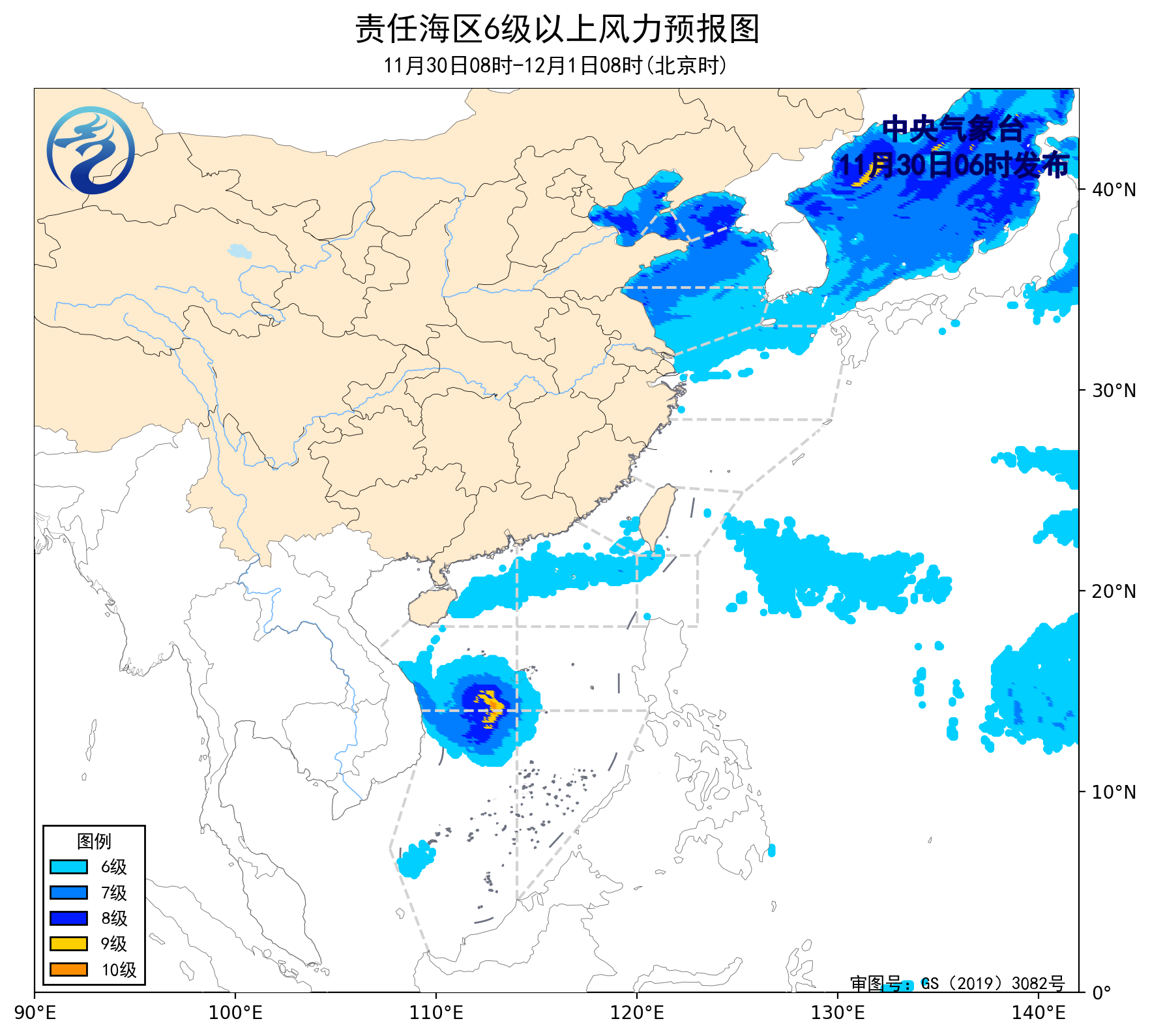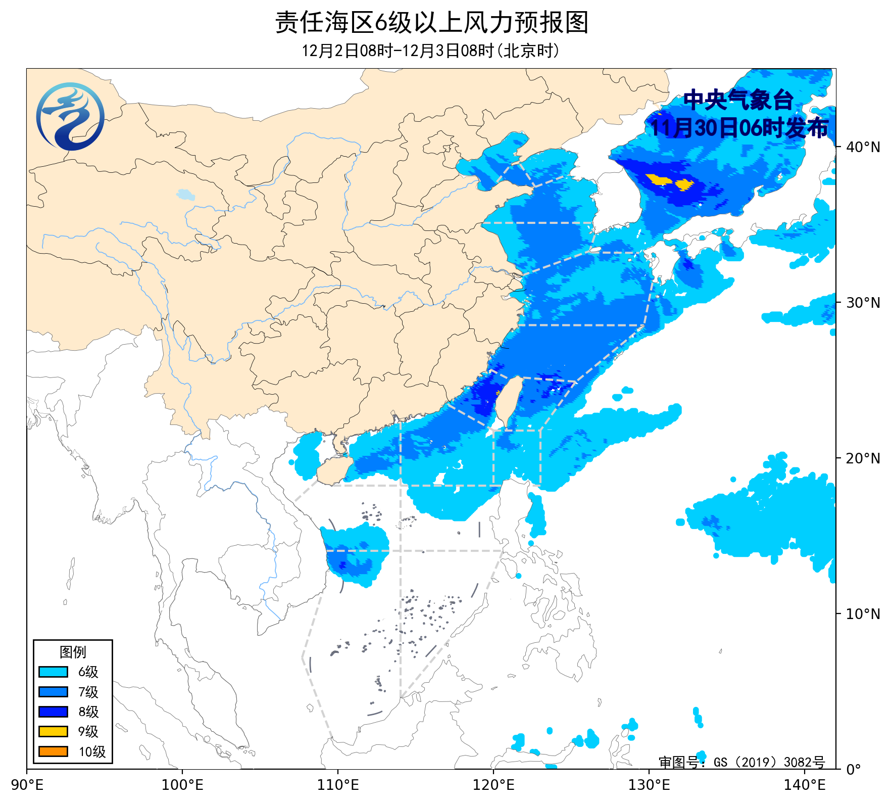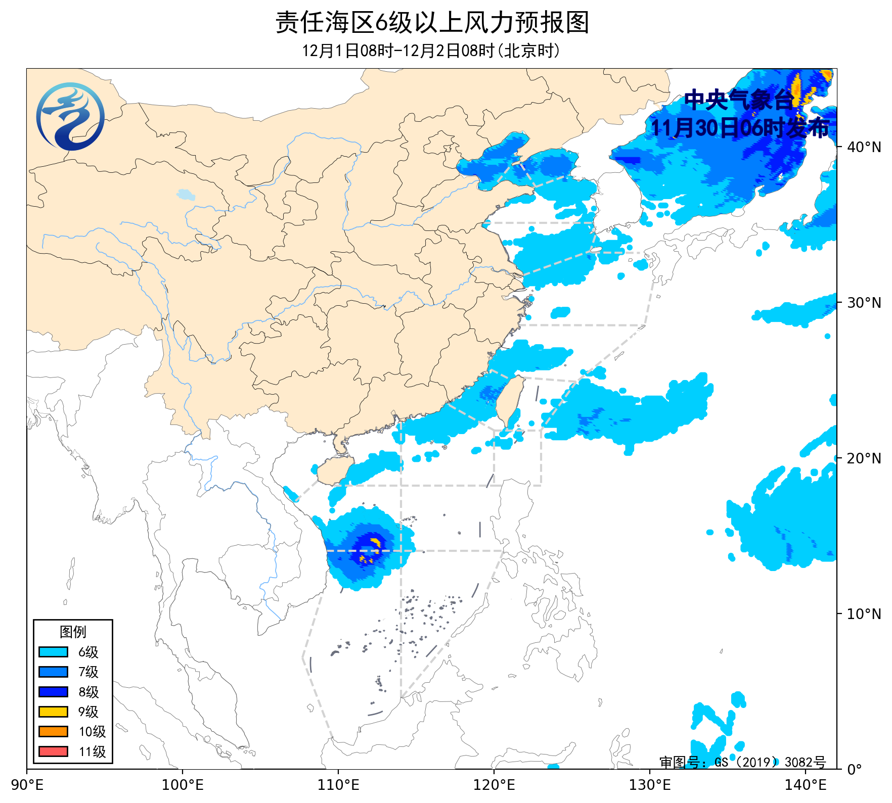 11月30日08时至12月1日08时,渤海、黄海北部海域将有6~8级、阵风9级的西北风到偏北风,渤海海峡将有6~8级、阵风9级的偏西转偏北风,南海西南部和中西部海域将有7~8级、阵风9~10级的旋转风,局部海域风力可达9~10级、阵风11~12级,黄海中部和南部海域将有6~7级、阵风8级的偏西到西北风,东海北部海域将有5~6级、阵风7级的西南风转偏北风,南海中东部海域将有4~6级、阵风7级的偏南到东南风,台湾海峡、巴士海峡、南海北部海域将有4~6级、阵风7级的偏北到东北风。