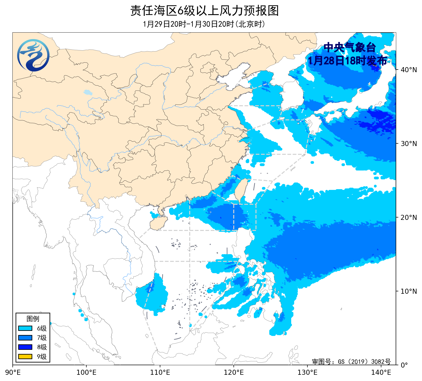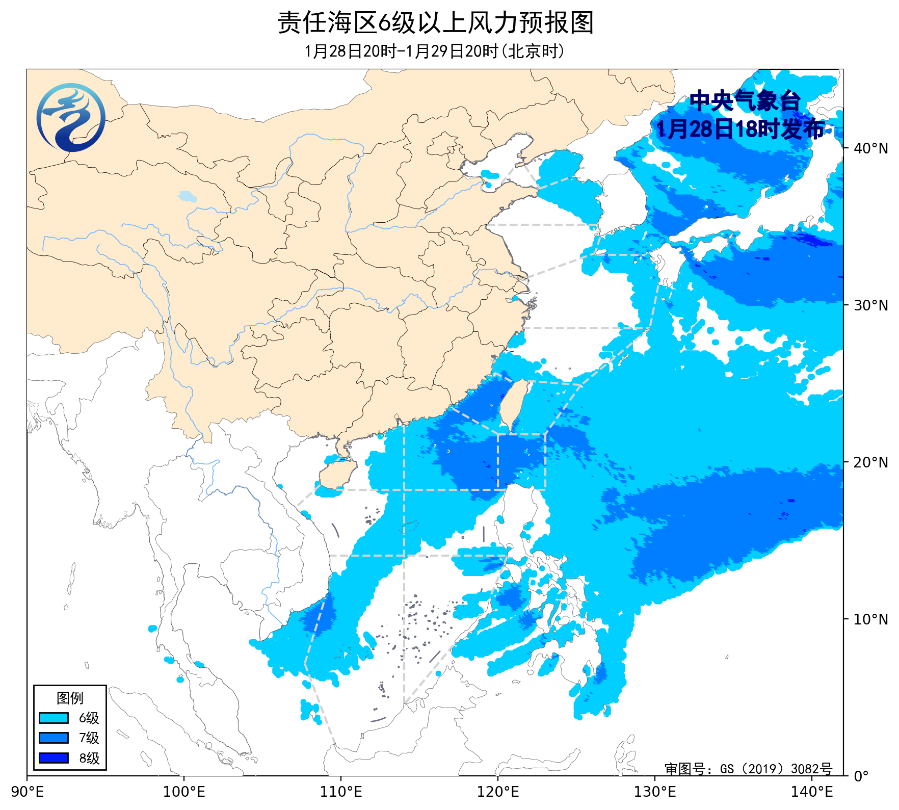 28日20时至29日20时,台湾海峡、巴士海峡、南海东北部海域将有5~7级、阵风8级的偏东到东北风,黄海中部海域将有4~6级、阵风7级的东北风转西北风,黄海北部海域、东海大部海域、台湾以东洋面、南海西南部海域将有4~6级、阵风7级的偏北到东北风,南海西北部、中部和南海东南部海域将有4~6级、阵风7级的偏东到东北风。