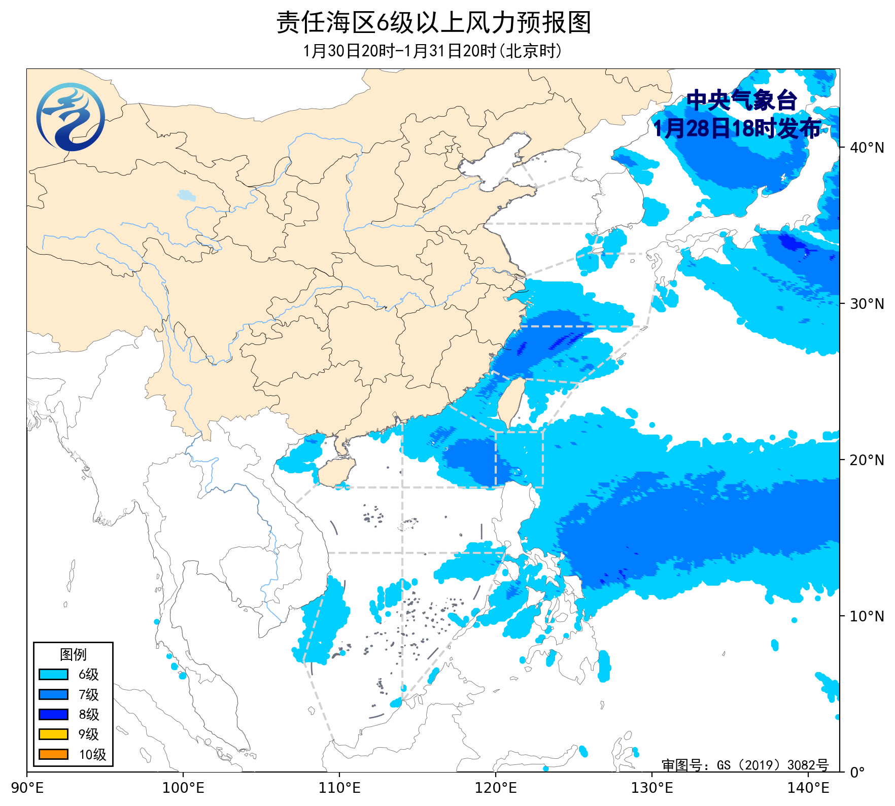 预计,1月31日夜间至2月4日夜间,渤海、渤海海峡、黄海大部海域、琼州海峡将有5~6级、阵风7级的风,东海大部海域将有8~9级、阵风10级减弱至6~7级、阵风8级的风,台湾海峡将有7~9级、阵风10级的大风,台湾以东洋面、南海大部海域将有6~8级、阵风9级的大风,巴士海峡将有7~8级、阵风9级的大风,北部湾将有6~7级、阵风8级的风。