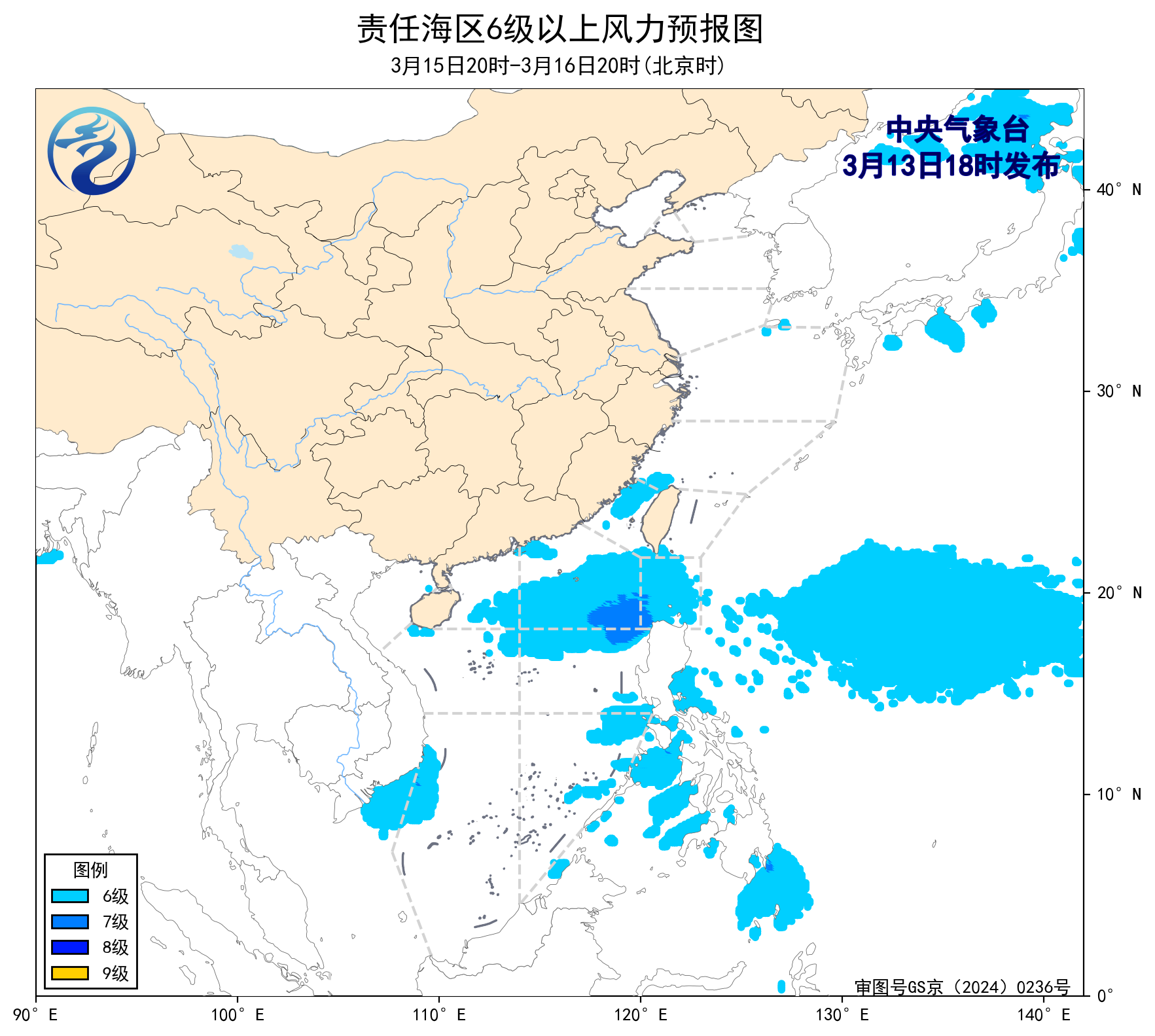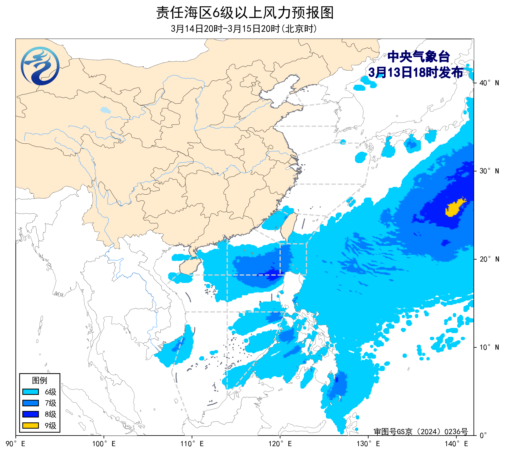 3月13日02时至14时,东海大部海域、台湾以东洋面、南海南部海域出现了5~7级、阵风8级的偏北风或东北风,台湾海峡、巴士海峡、南海北部和中部海域出现了6~8级、阵风9级的东北风或偏东风。