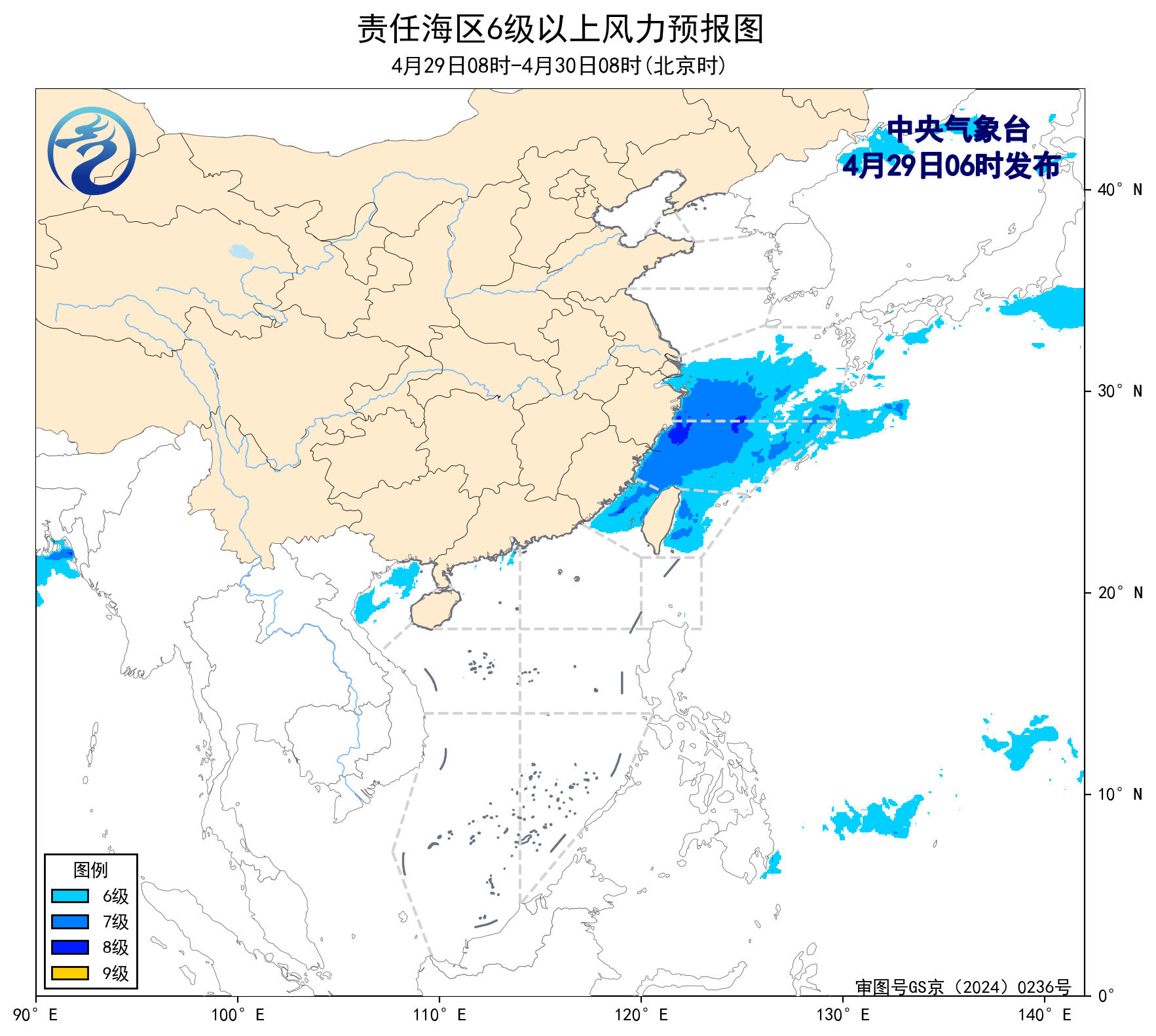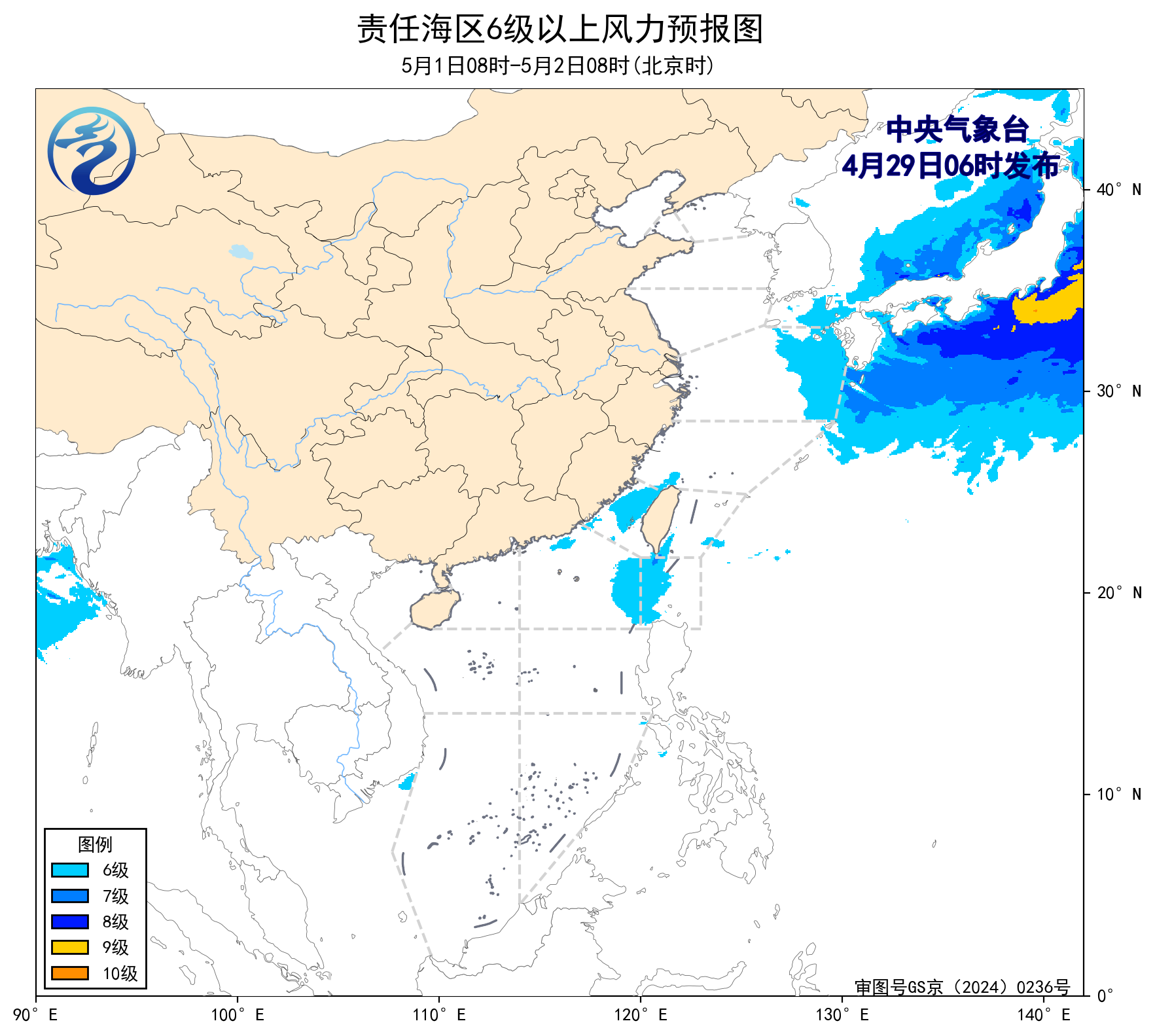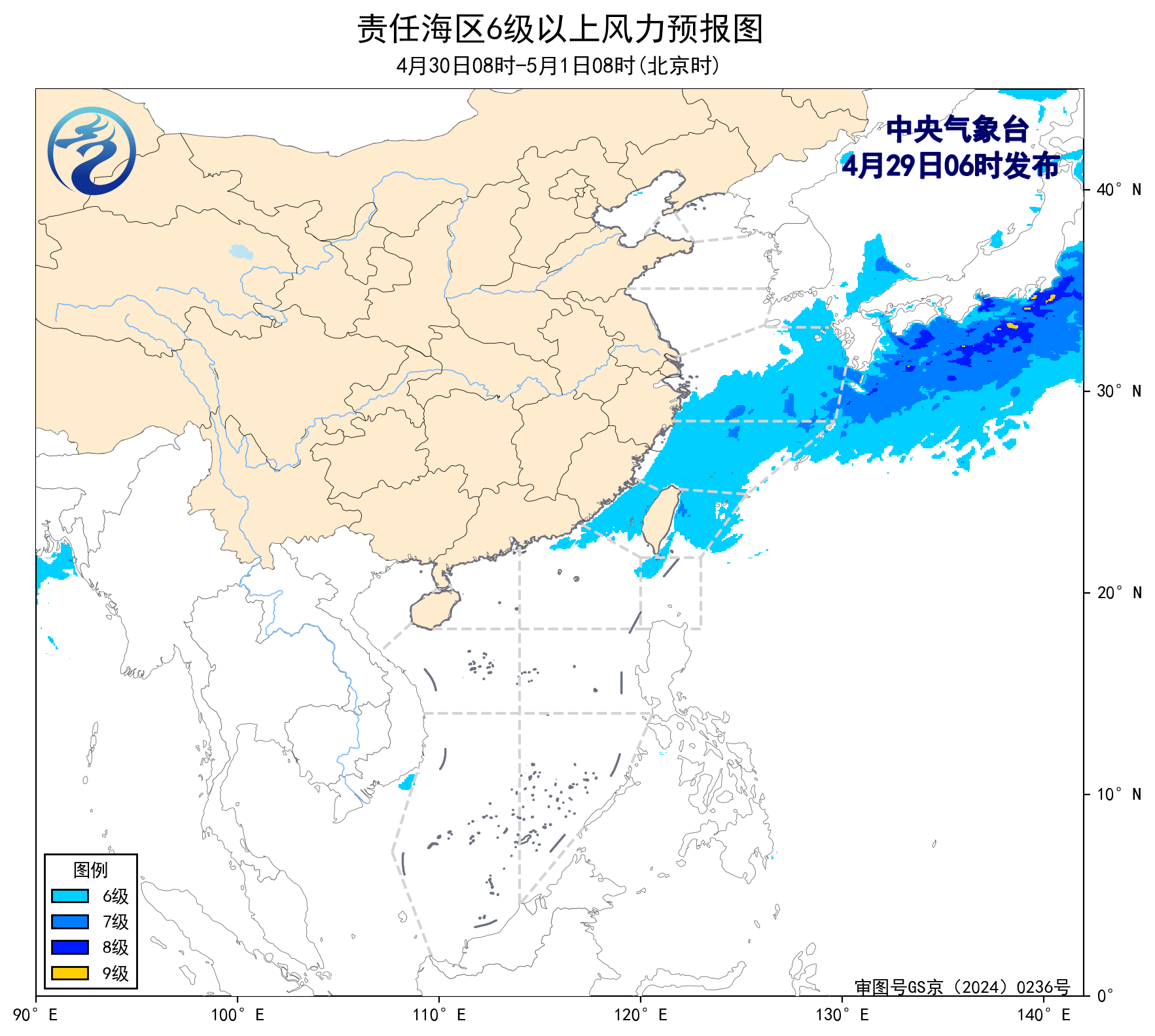 4月30日08时至5月1日08时,东海北部海域将有5~6级、阵风7级的偏北到西北风,东海南部海域、台湾海峡、台湾以东洋面将有5~6级、阵风7级的偏北到东北风。