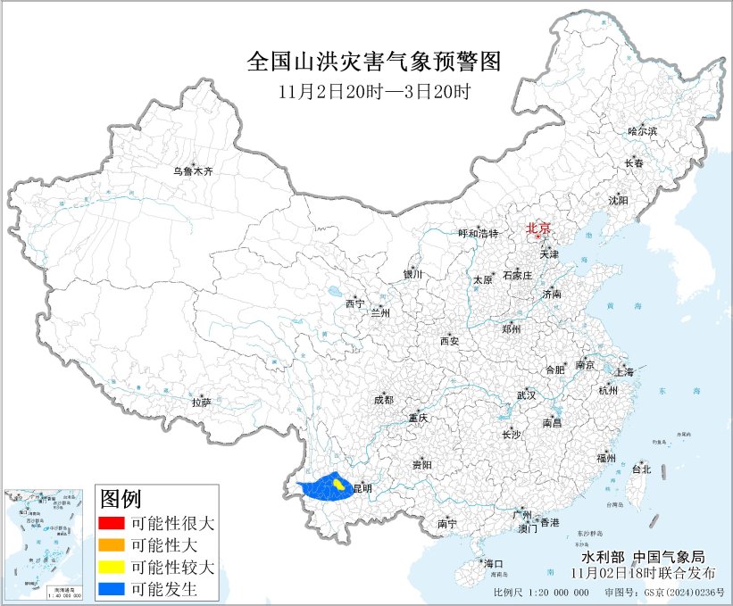 预计,11月2日20时至3日20时,云南中部和西部等地部分地区可能发生山洪灾害(蓝色预警),其中,云南中部局地发生山洪灾害可能性较大(黄色预警)。其他地区也可能因局地短历时强降水引发山洪灾害,请各地注意做好实时监测、防汛预警和转移避险等防范工作。