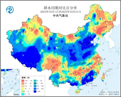 图1 2025年10月全国降水量与常年(左)和2024年(右)同期对比