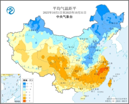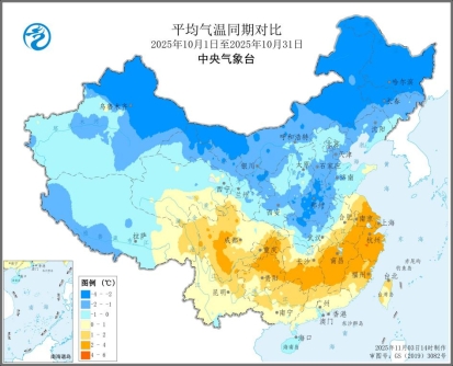 图2 2025年10月全国平均气温与常年(左)和2024年(右)同期对比