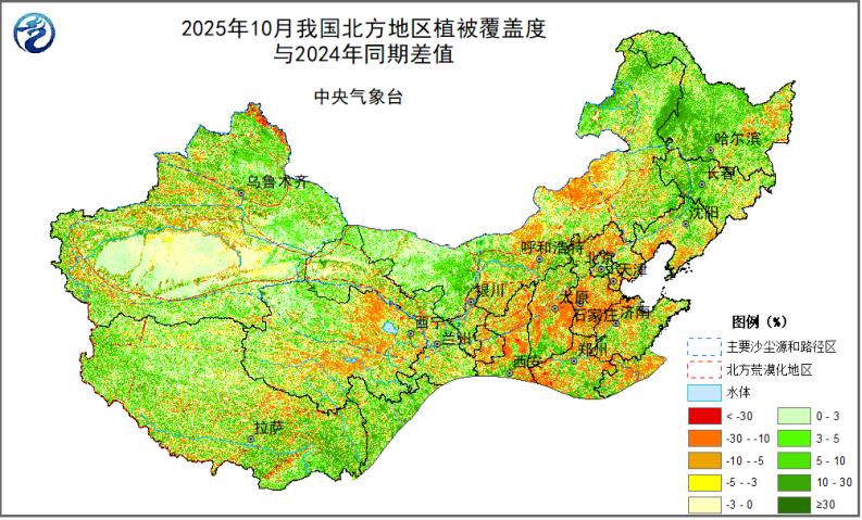 图3 2025年10月北方地区植被覆盖度与2024年同期对比