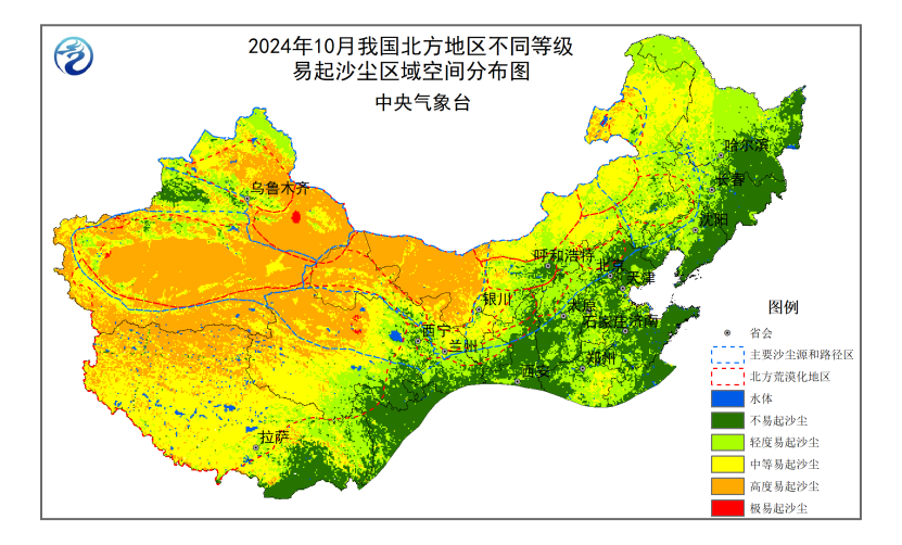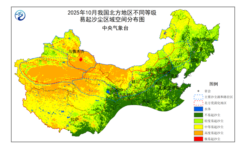 摘要:2025年10月,北方荒漠化区大部气温较常年和2024年同期略偏低,降水量偏多,利于土壤增墒,大部植被覆盖度接近或略高于2024年同期,地表易起沙尘面积较2024年同期减小9.9%,其中西藏西北部、青海西部、内蒙古西部等地高度和极易起沙尘等级面积明显减小,华北大部不易起沙尘等级较2024年明显增加。10月北方大部地区沙尘天气发生日数较2024年同期偏少1~3天,仅东北地区中西部局地沙尘天气发生日数有零星增加。