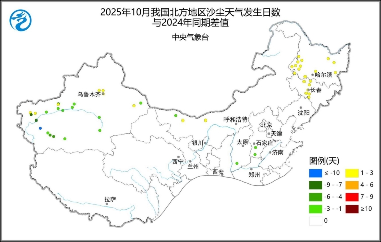 生态气象监测评估结果显示,2025年10月,北方荒漠化区大部降水偏多,利于土壤增墒、植被覆盖度增加和植被防风固沙能力提高,地表易起沙尘面积较2024年同期减小9.9%(图4),其中西藏西北部、青海西部、内蒙古西部等地高度和极易起沙尘等级面积明显减小,华北大部不易起沙尘等级面积较2024年明显增加。地面沙尘天气观测统计数据表明,10月北方大部沙尘天气发生日数较2024年同期偏少1~3天(图5),新疆南部部分地区偏少4~10天;仅吉林西部、黑龙江西南部局地沙尘天气发生日数有零星增加。