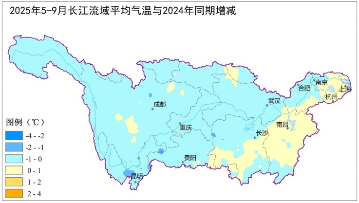 图1 2025年5-9月长江流域平均气温与2024年同期对比