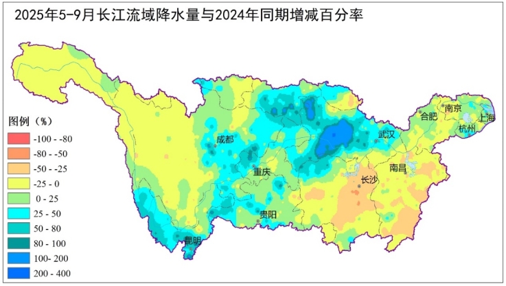 图2 2025年5-9月长江流域降水量与2024年同期对比