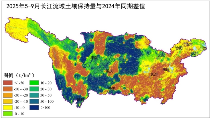 图6 2025年5-9月长江流域土壤保持功能与2024年同期对比