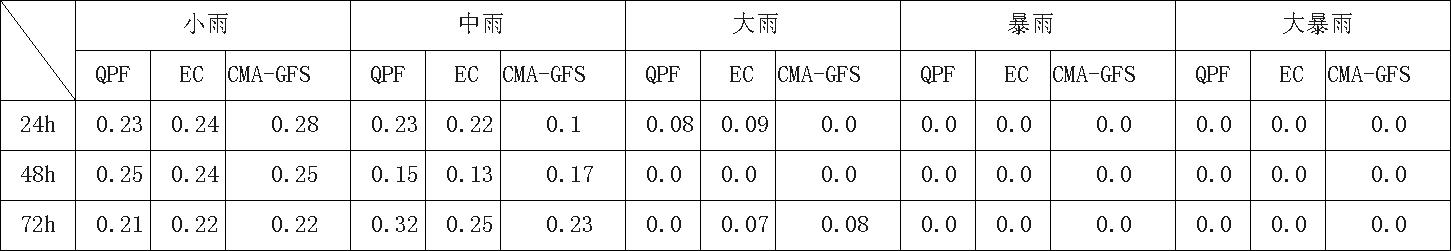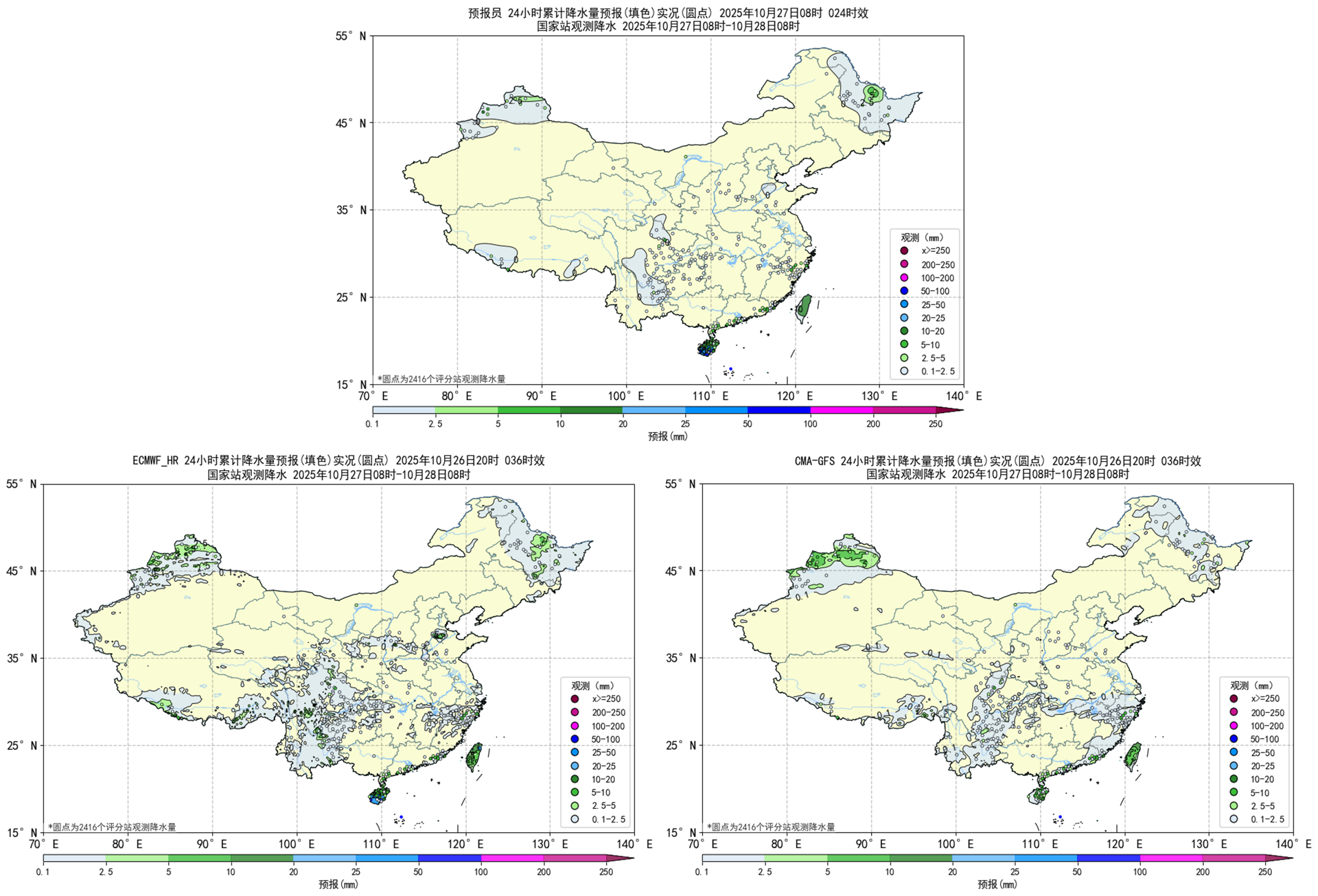 过去24小时,预报员对于小雨量级降水预报TS评分高于EC和GFS-CMA模式,对于中雨量级降水预报TS评分均低于EC和CMA-GFS模式。预报员对东北地区东北部、新疆北部、云南东部、广东雷州半岛和海南岛的降水落区预报均有所体现,但对于西南地区、东南地区和华北地区局地降水落区有所漏报。