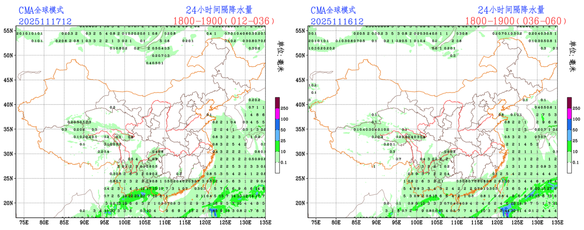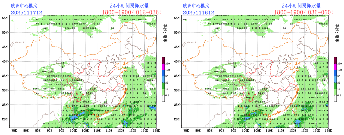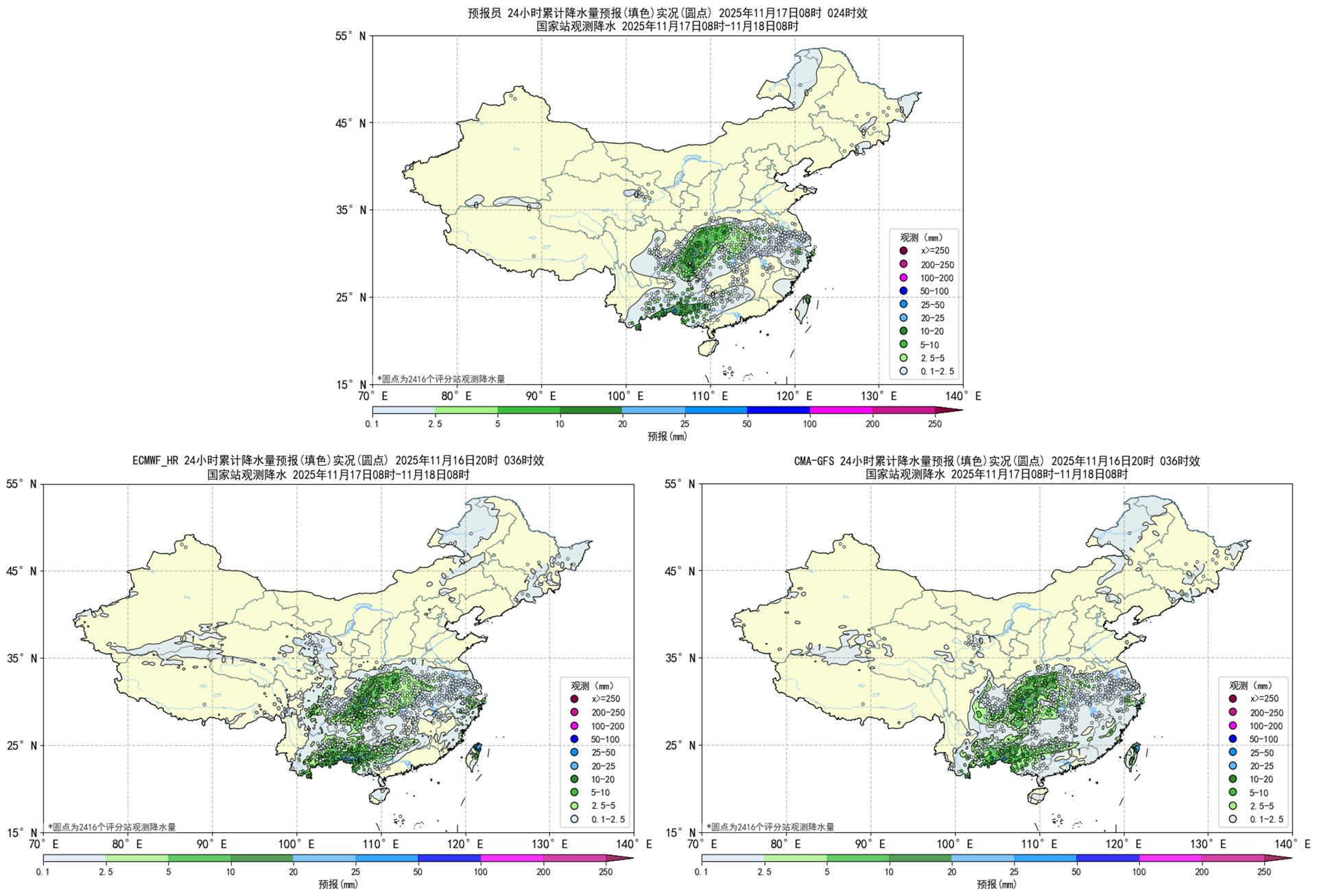过去24小时,EC模式对全国范围降水预报效果较好,小雨和中雨预报TS评分高,CMA-GFS模式对湖北、安徽等地的中雨存在漏报。