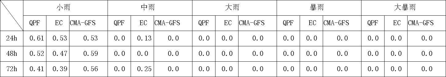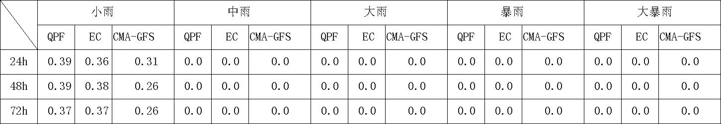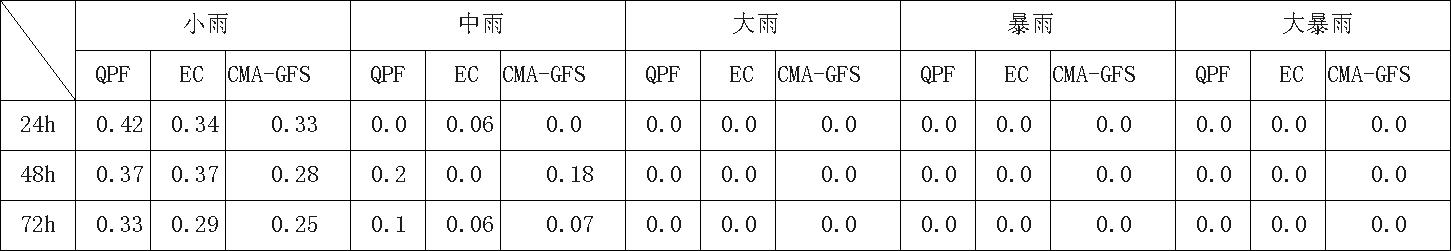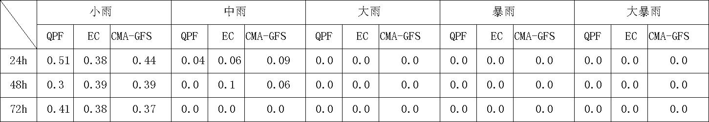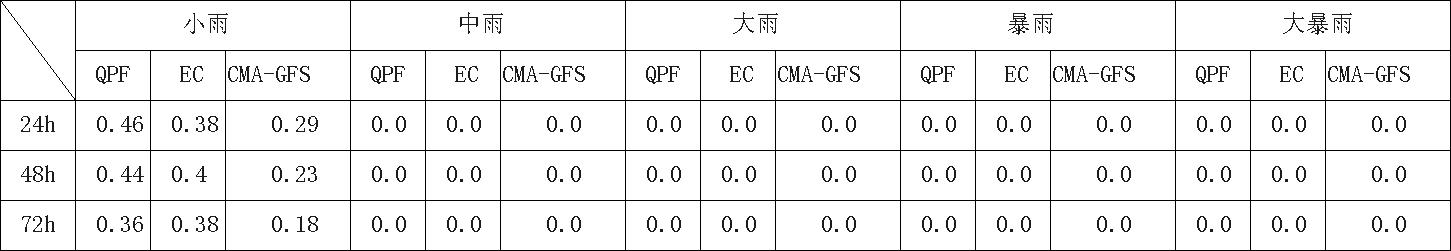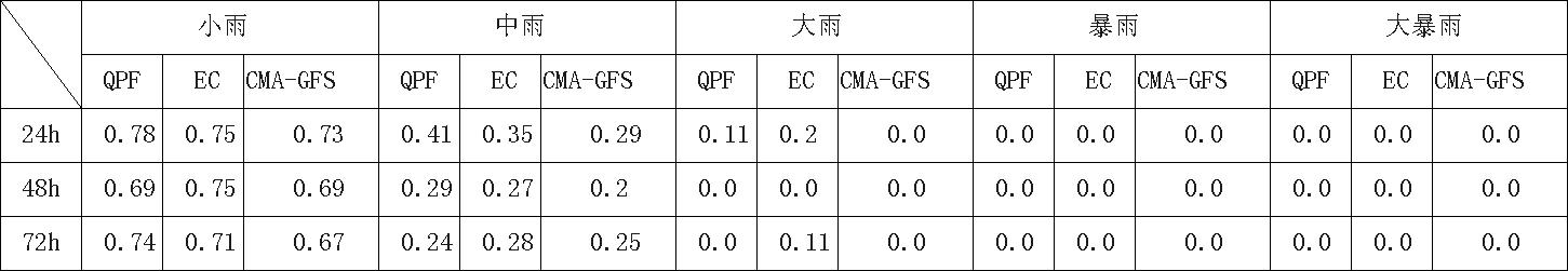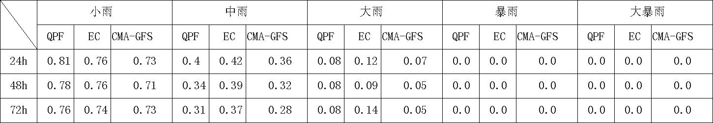 表1 预报员、ECMWF_HR、CMA-GFS模式各量级降水1-3天预报TS评分表