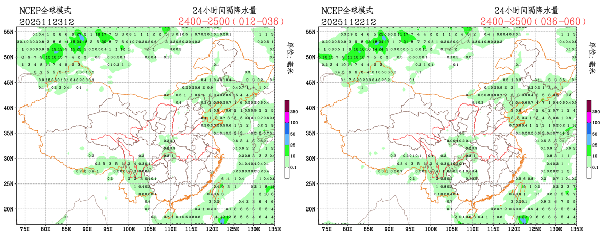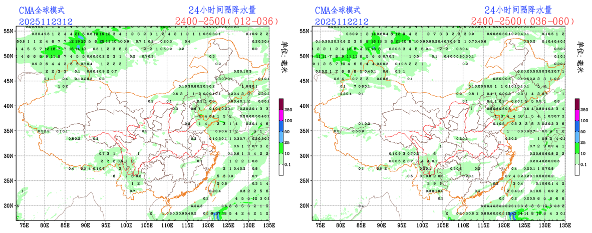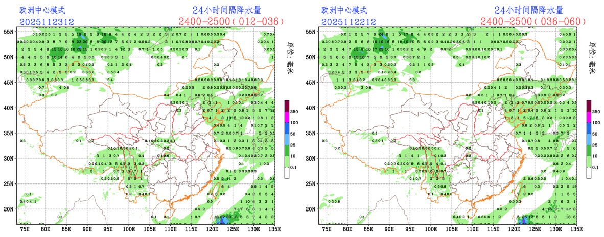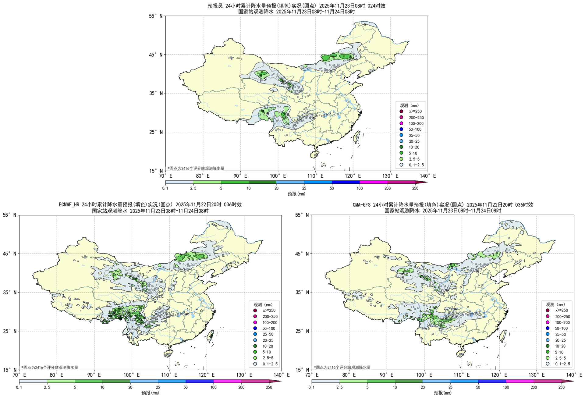 过去24小时,预报员对于小雨量级降水的预报TS评分高于EC模式和CMA-GFS模式。预报员对内蒙古地区东部、西北地区西北部、西南地区和西藏地区东部降水落区有较好的体现,但部分地区的预报降水量比实测偏高,对江汉地区降水有一定的空报。