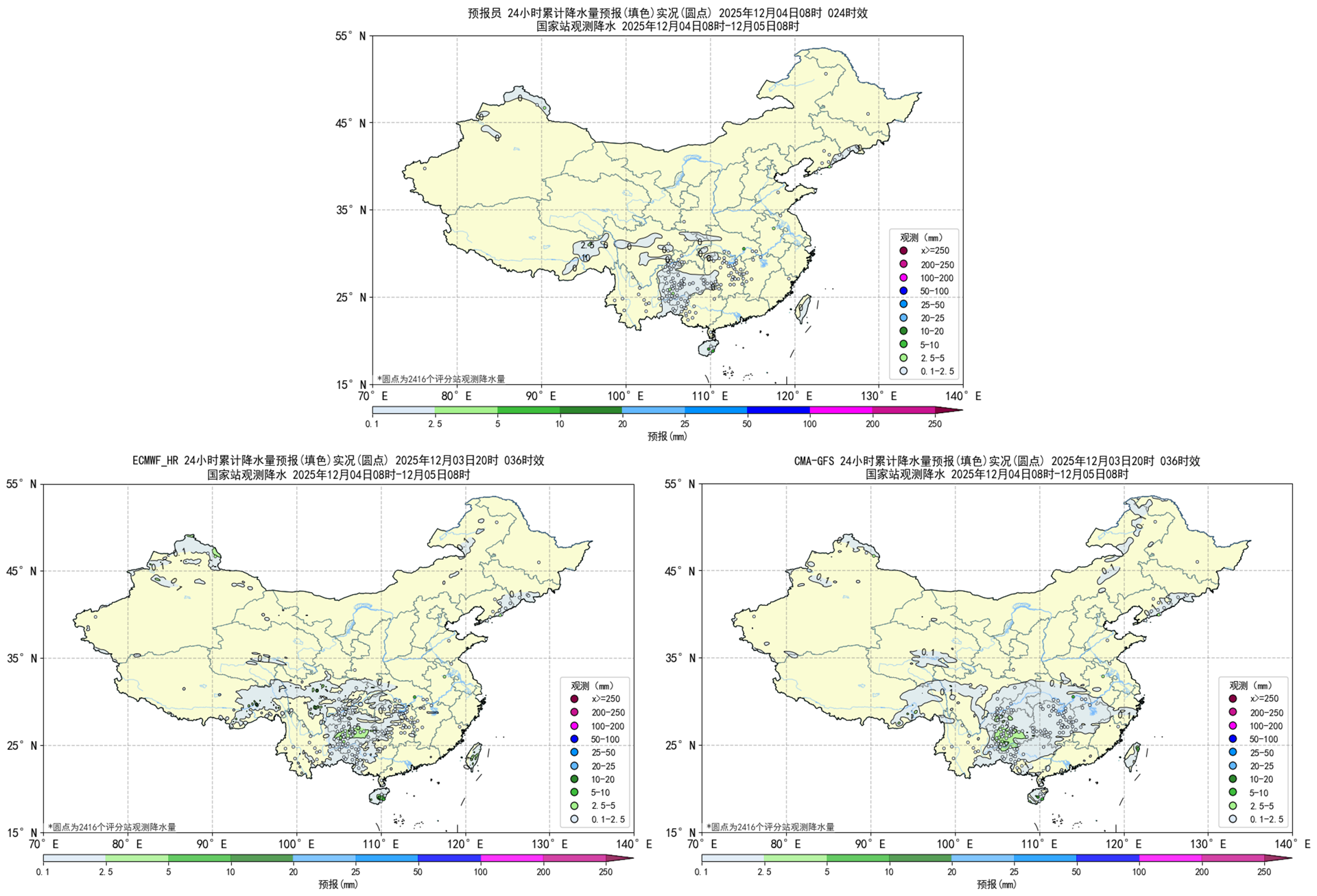 过去24小时,预报员对于小雨量级降水TS评分与EC持平,高于CMA-GFS。预报员对于贵州大部至广西西部的降水落区有所体现,对于湖南的降水落区有所漏报。