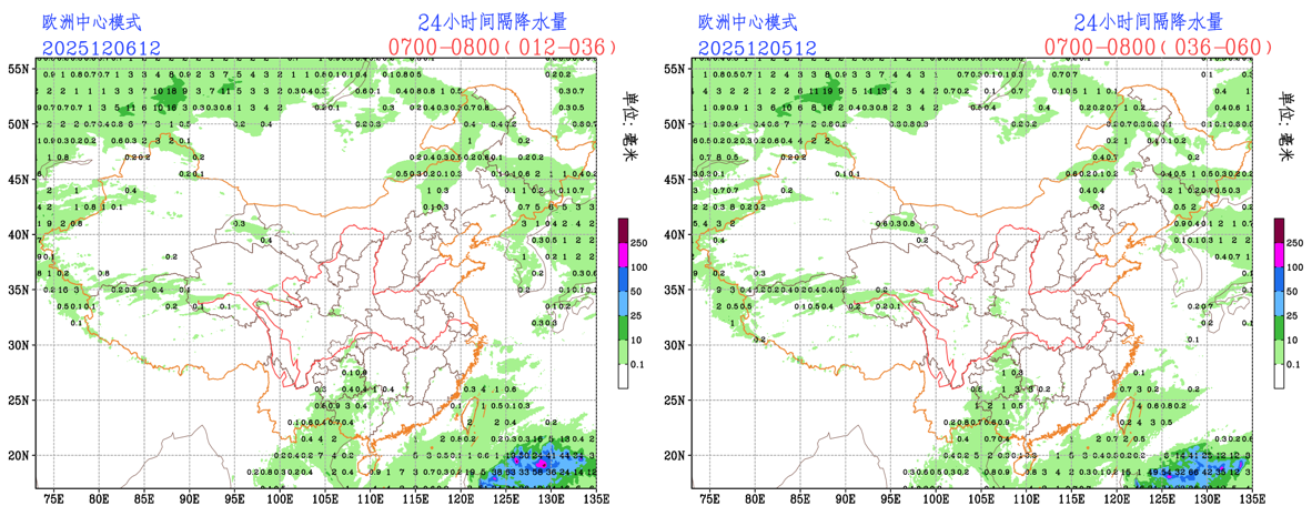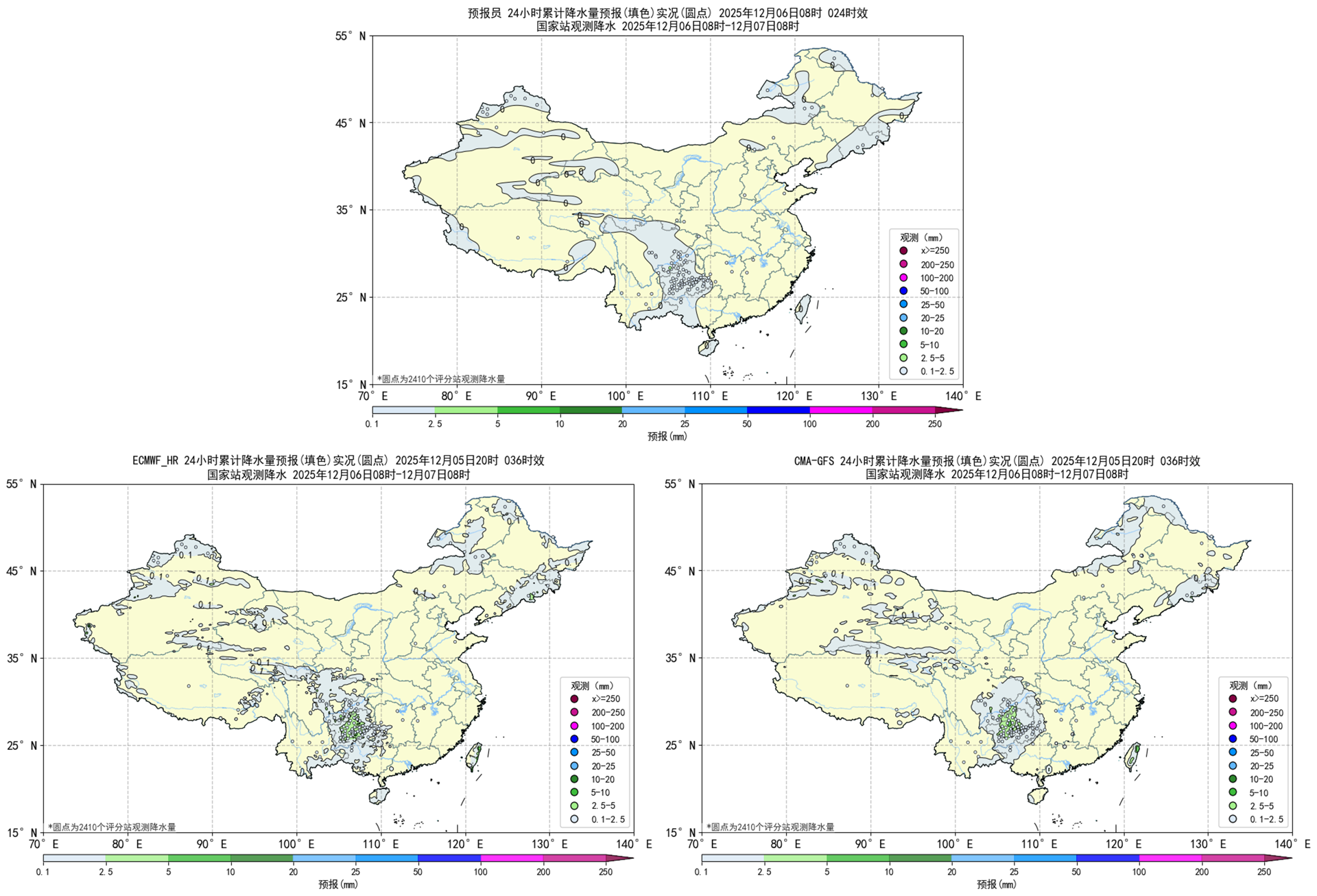 过去24小时,预报员对小雨量级的降水预报TS评分略低于模式结果。预报员对西北地区中部和四川北部的降水有所空报,对江南西北部和云南中部的降水有所漏报。EC模式和CMA模式对西北地区中部和四川北部的降水有所空报,对江南西北部和云南中部的降水有所漏报,对西南地区降水预报偏大。