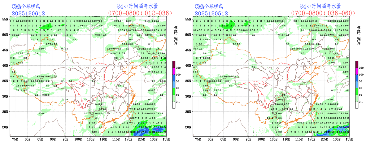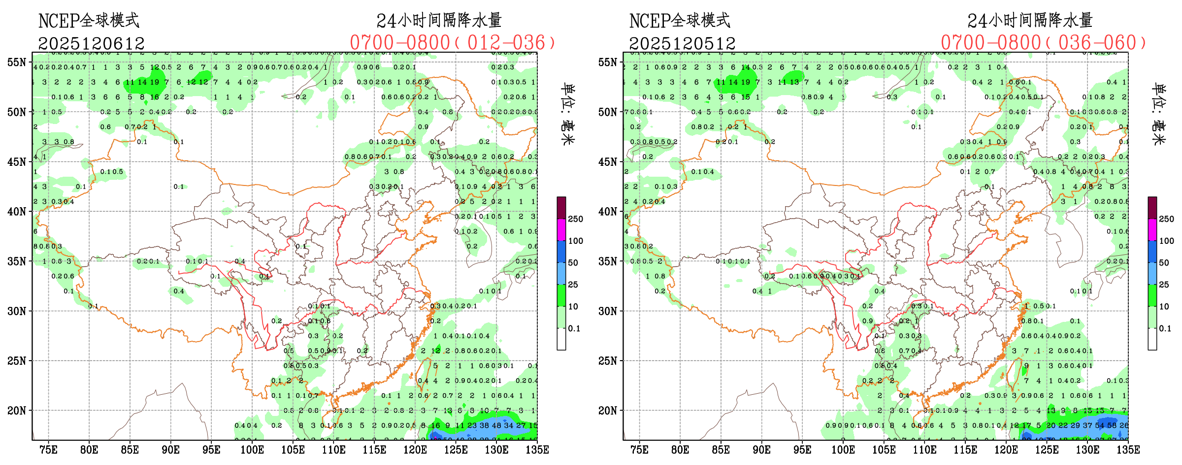 未来24小时,EC模式对云南东南部降水略有调小,青藏高原西北侧降水范围略有调大;CMA模式对西南地区东部、内蒙古东部的降水范围略有调小,对青藏高原西北侧降水范围略有调大;NCEP模式对西南地区东部降水范围略有调小。预报员可参考模式订正预报结果。