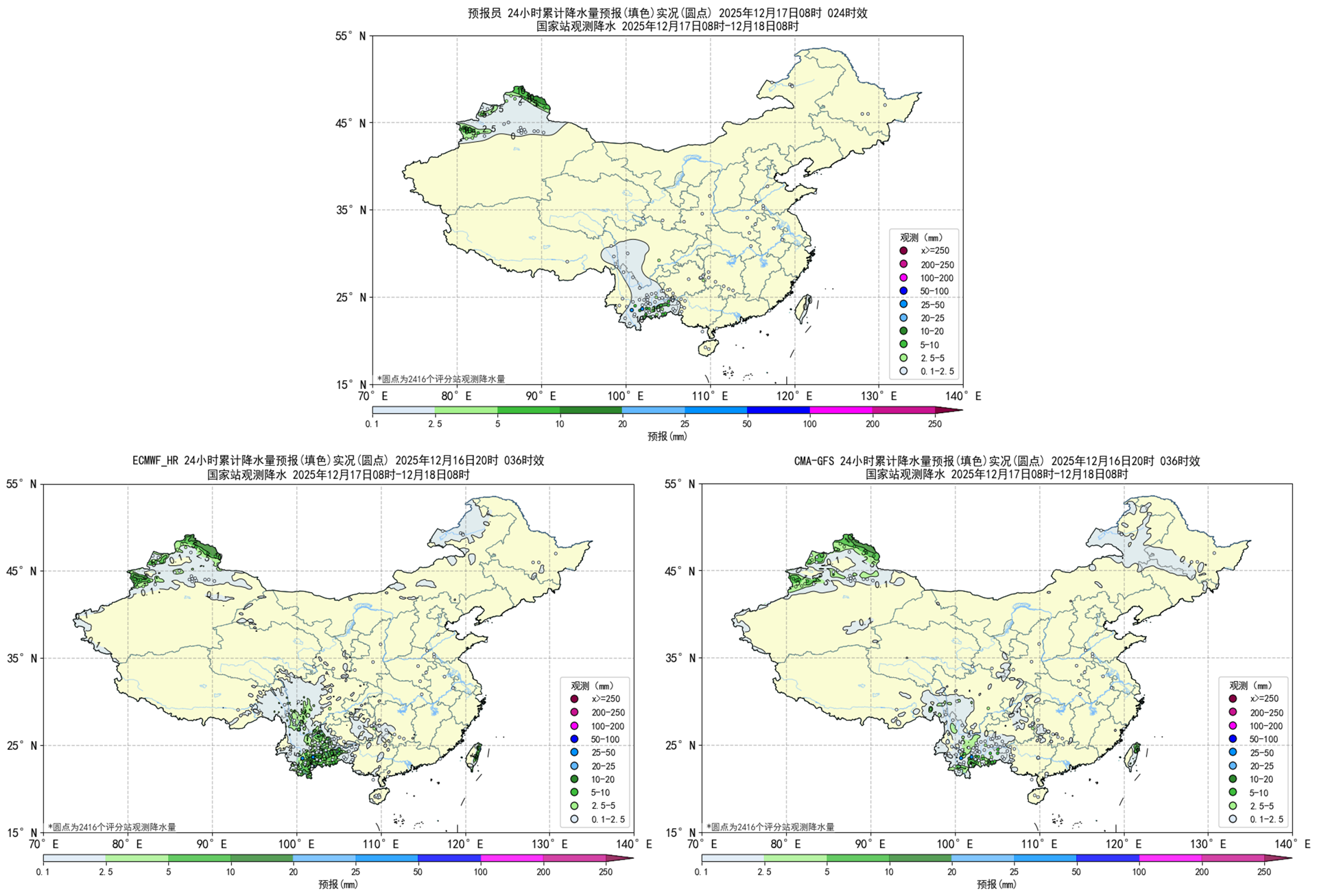 过去24小时,预报员对于小雨量级降水预报TS评分高于各家模式,中雨量级降水TS评分低于EC模式。预报员和各家模式对于北疆地区及西南地区的降水落区有所体现,但量级略有漏报。