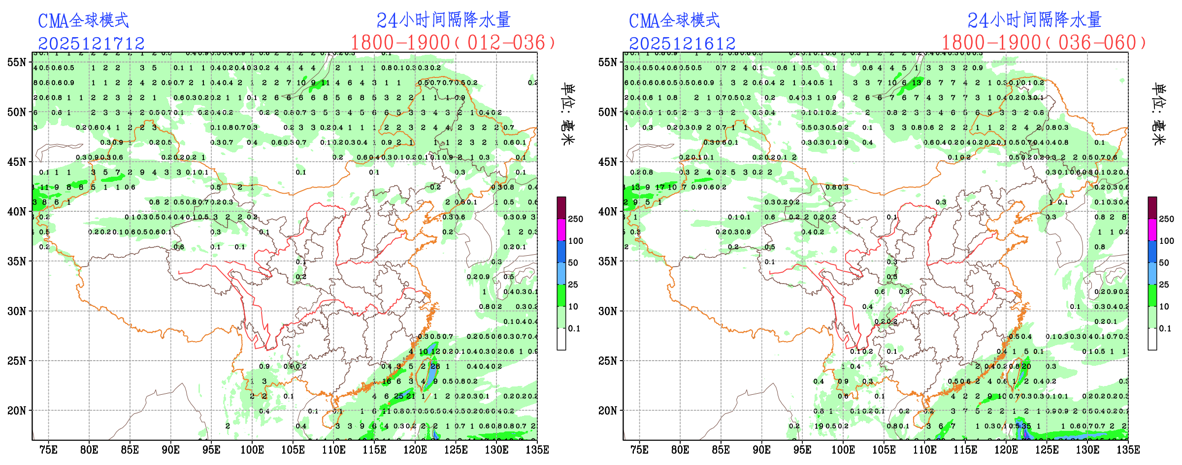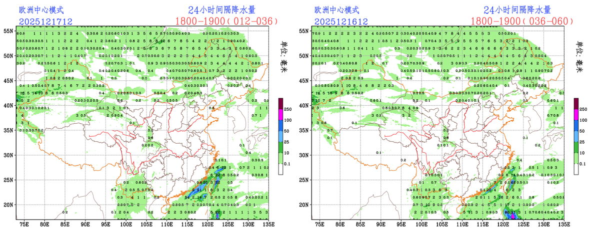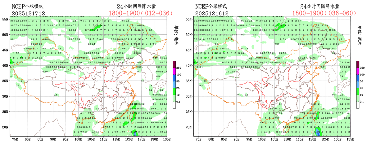 未来24小时,EC和CMA-GFS对于广东东部沿海及福建南部沿海的降水量级有所调大,NCEP对于内蒙古中东部的降水落区有所调大。预报员可参考模式结果进行必要订正。