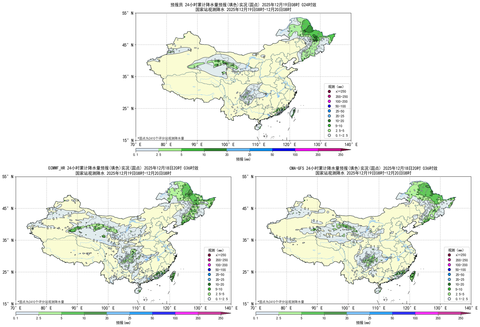 过去24小时,预报员对小雨量级的降水预报TS评分优于模式,对中雨量级的预报则低于模式。预报员对江南地区东部降水有所漏报且降水量级有所低估,对西北地区中部的部分地区有所空报。EC模式和CMA模式对江南地区东部降水量级有所低估,对西北地区中部的部分地区有所空报。