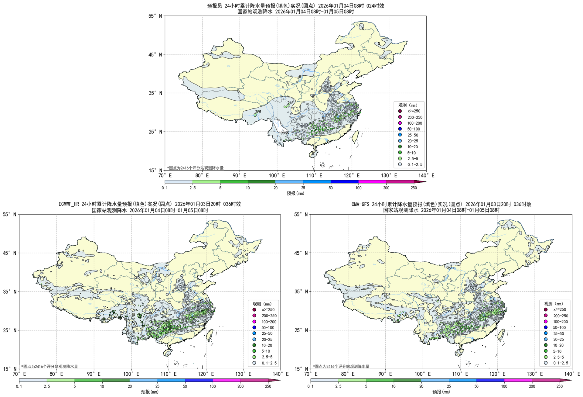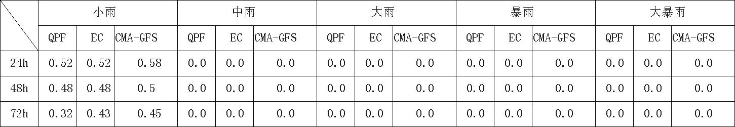 过去24小时,预报员的小雨量级降水预报TS评分高于EC和CMA-GFS。预报员对于江南地区和西南地区的降水有一定低估,EC和CMA-GFS模式对于西南地区的降水落区有误报.