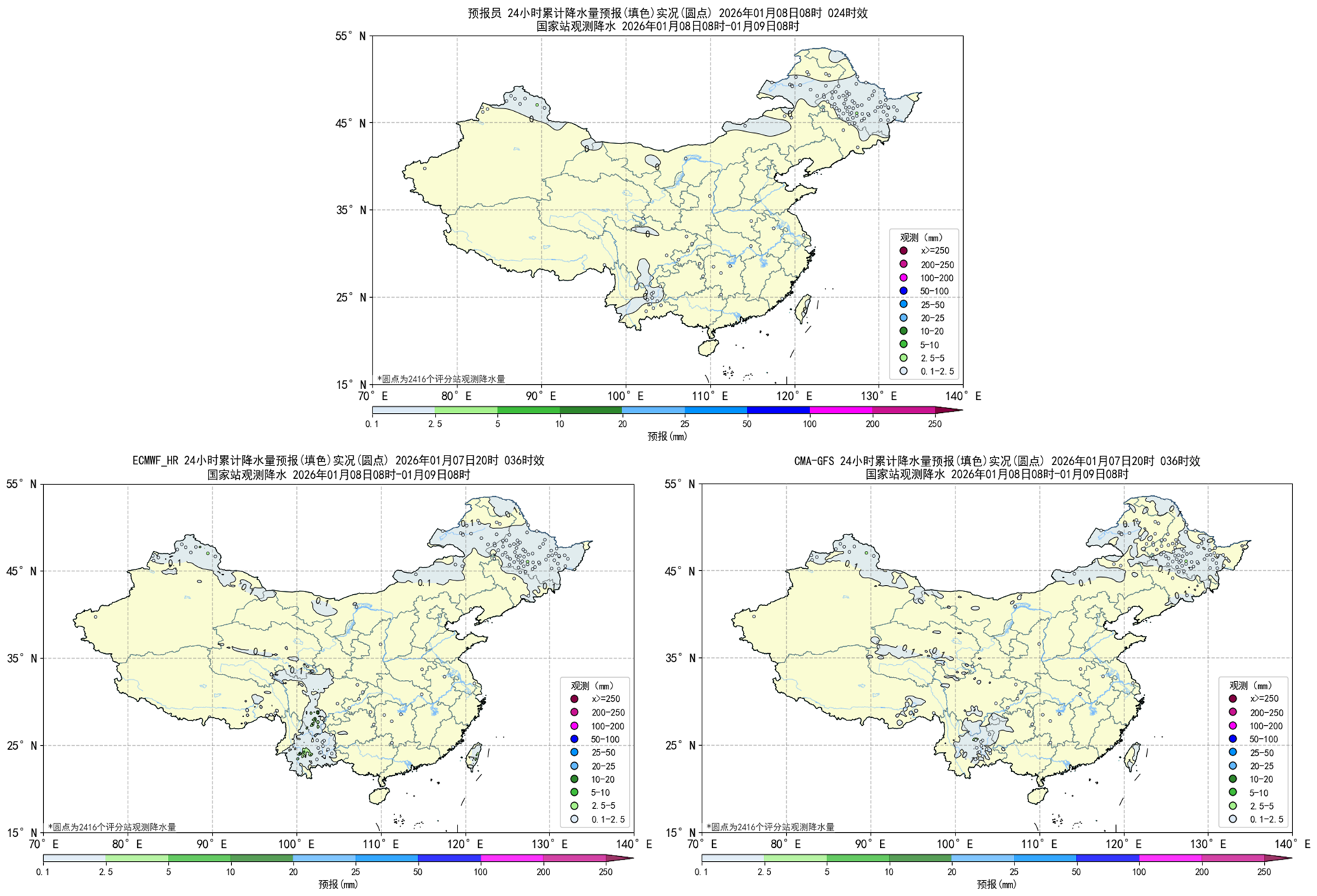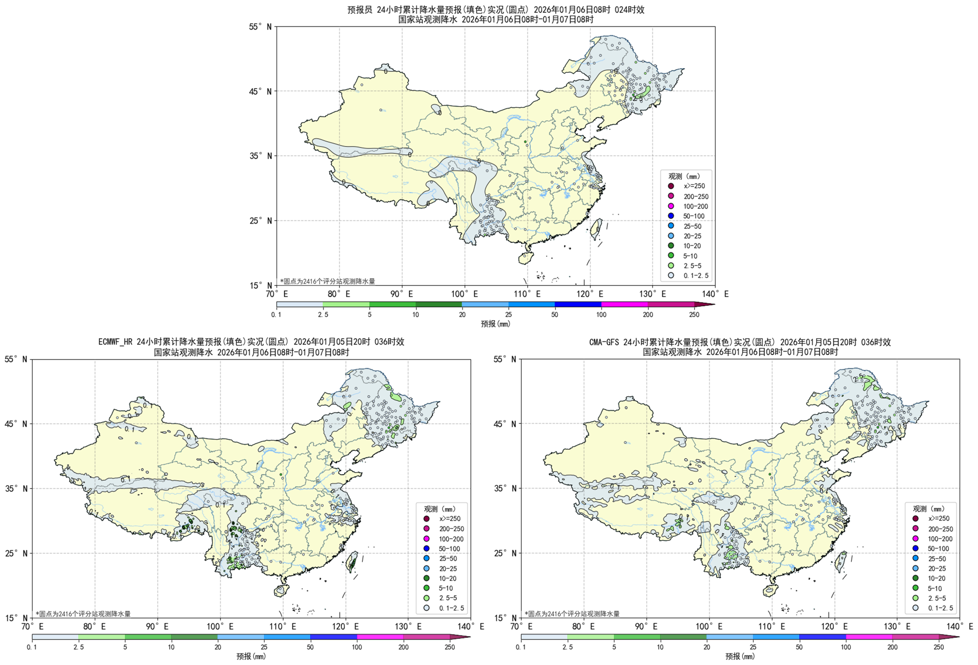 过去24小时,预报员的小雨预报TS评分优于EC模式和CMA-GFS模式;预报员对于云南中部、西南地区东部的小雨量级降水略有漏报;EC模式对于西南地区东部的小雨量级降水略有漏报,对西南地区北部、内蒙古地区北部的小雨量级降水有略有空报;CMA-GFS模式对于西南地区东部的小雨量级降水略有漏报,对内蒙古地区北部的小雨量级降水有略有空报。