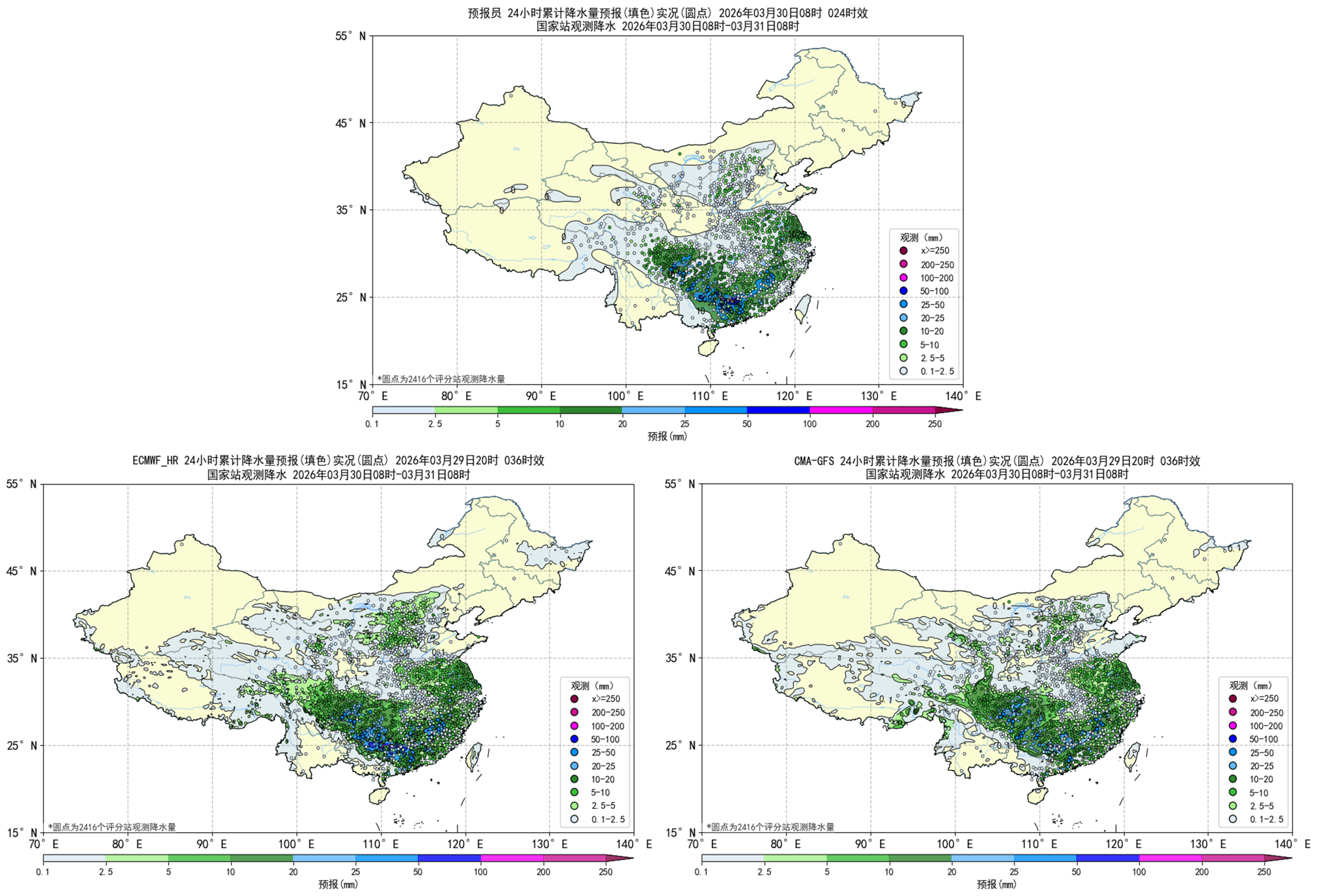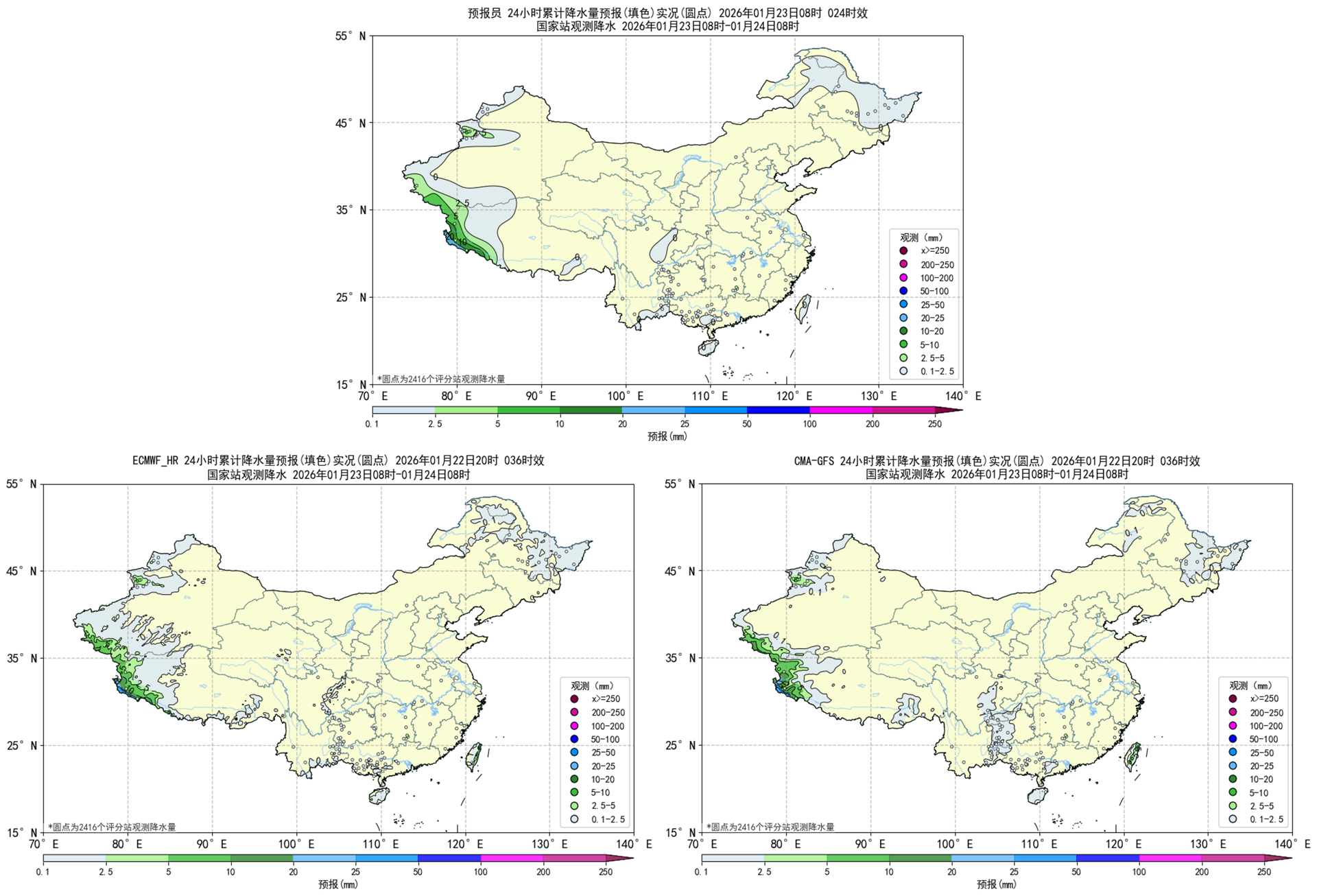 图2.1预报员、ECMWF_HR、CMA-GFS降水天气学检验