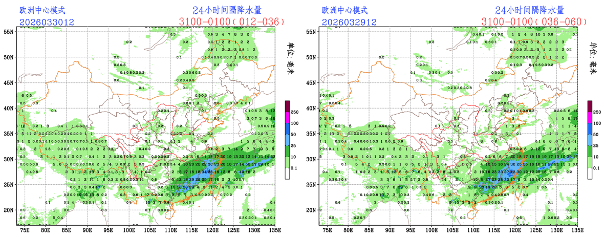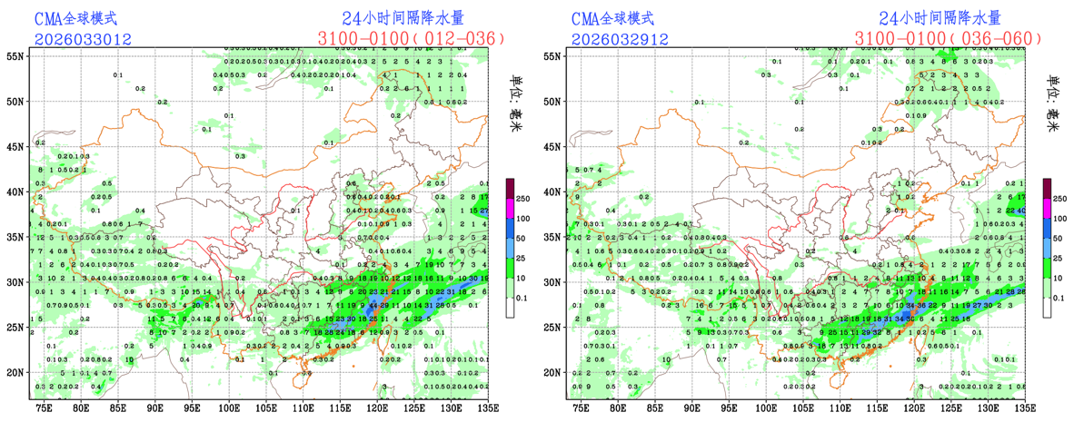 过去24小时,预报员对小雨量级降水的预报TS评分均优于EC和CMA模式;中雨量级和大雨量级的预报TS评分略低于EC模式。预报员对全国降水整体把握较好;EC模式和CMA-GFS模式空报了西藏大部、西北地区大部的降水。