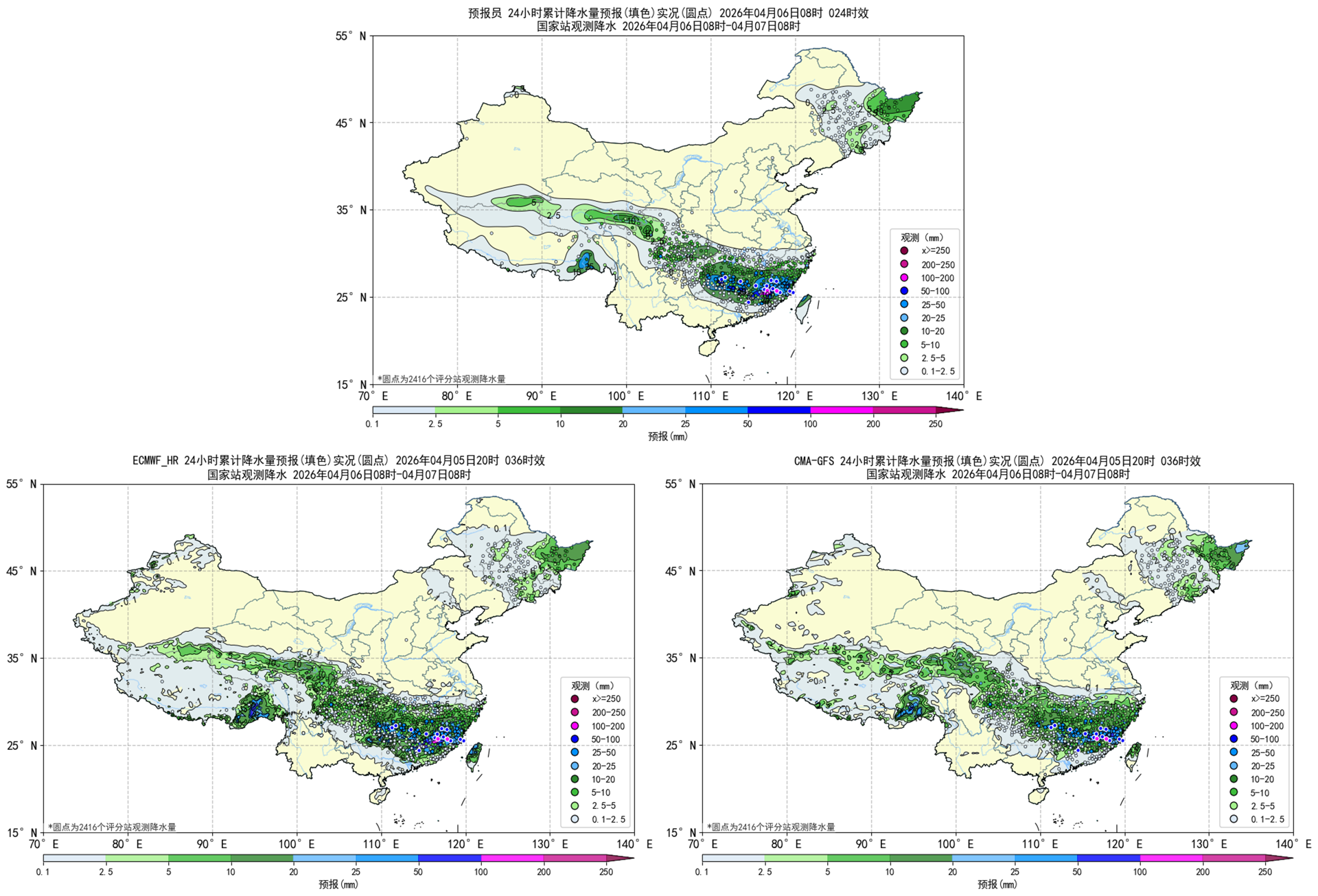 过去24小时,预报员对小雨、中雨和大雨量级的降水预报TS评分均优于EC和CMA-GFS模式。预报员对江南、华南、江淮、江汉、东北地区东部、西南地区东部和北部、西北地区南部和西藏东南部等地区的降水落区具有一定的指示意义,同时EC模式和CMA模式对上述地区的降水落区均有所体现,但预报员和各家模式对于华南北部局部地区的降水量级存在低估。