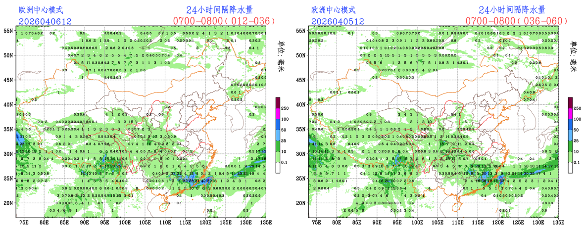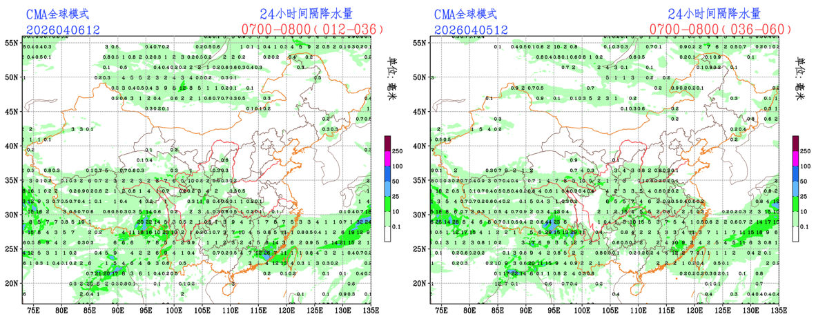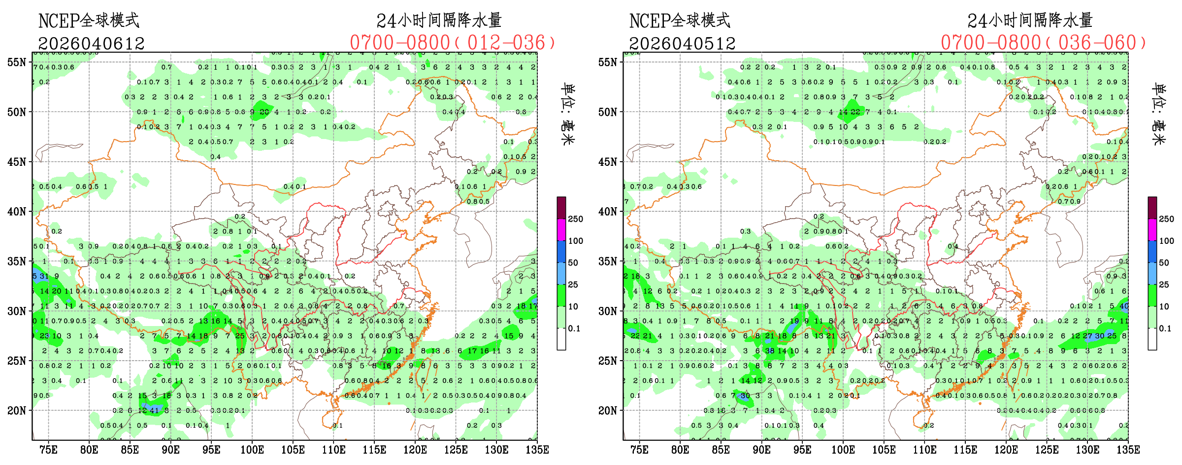 未来24小时,EC模式对降水落区和量级的预报较为稳定,CMA-GFS模式对广东北部的降水量级有所调小,NCEP模式对西藏地区南部的降水有所调小;整体来看,各家模式未来24小时的降水预报结果较为稳定,预报员可参考模式结果进行必要订正。